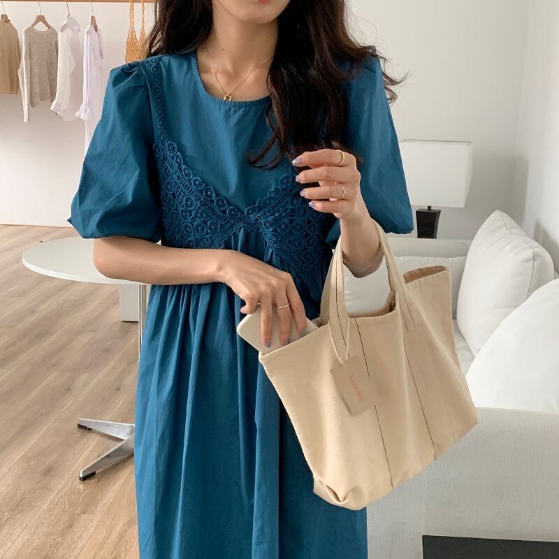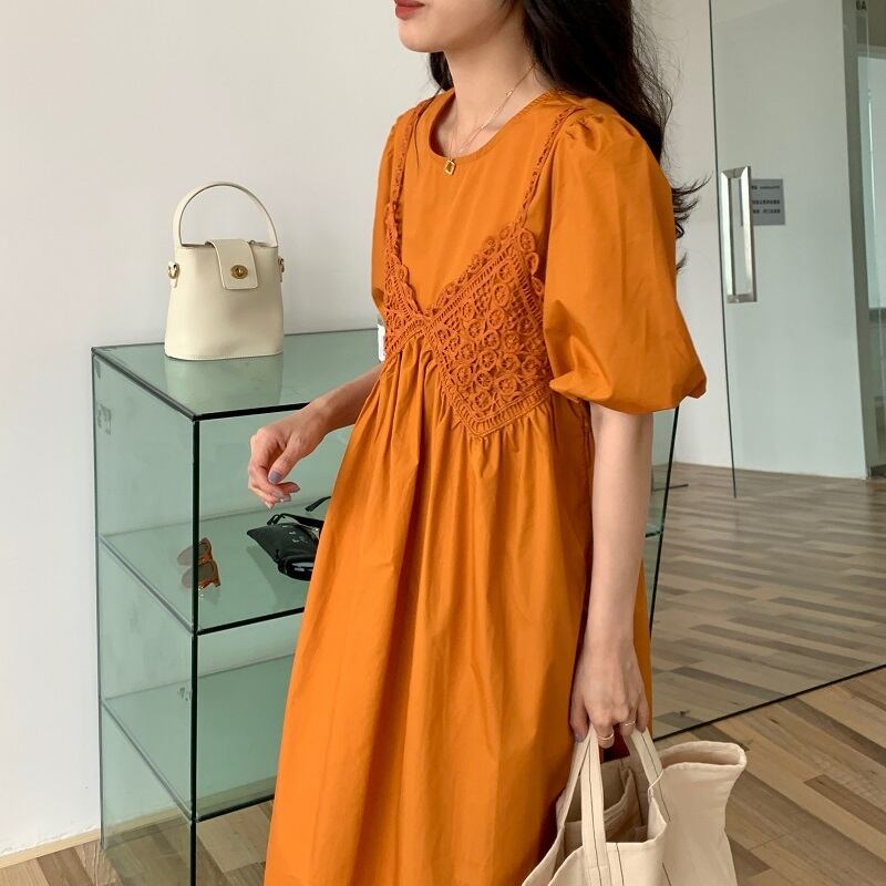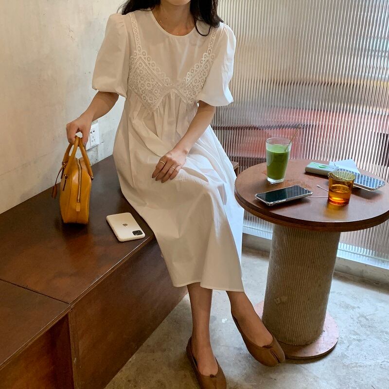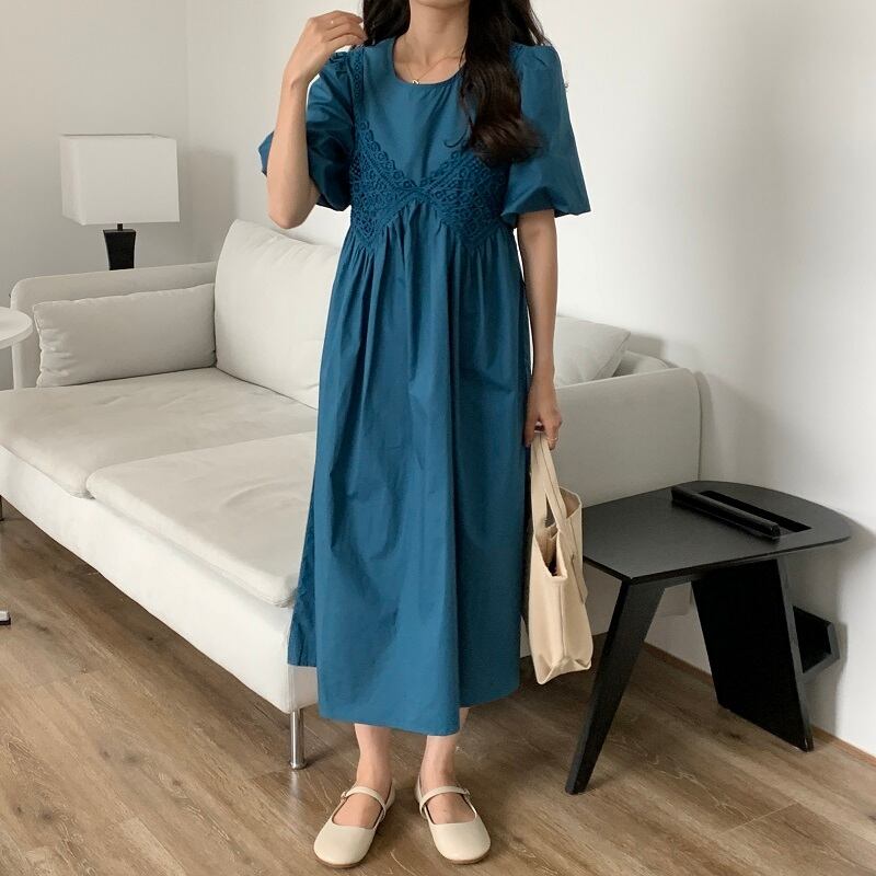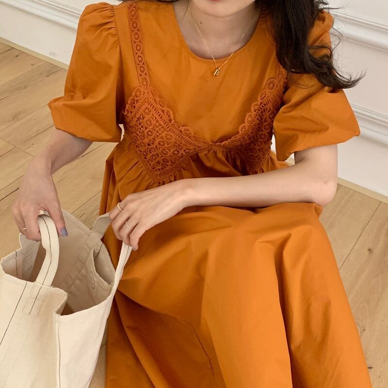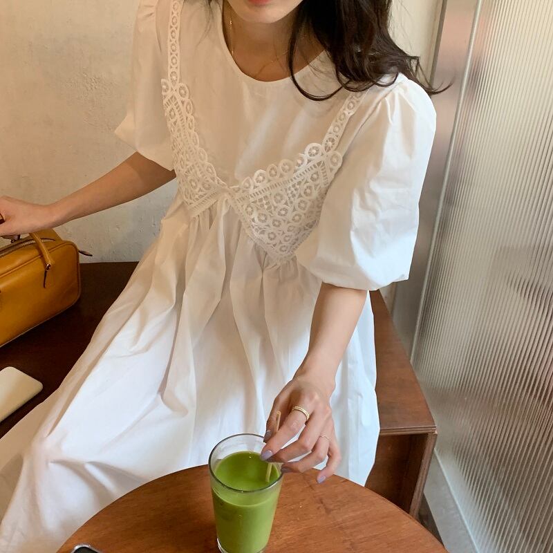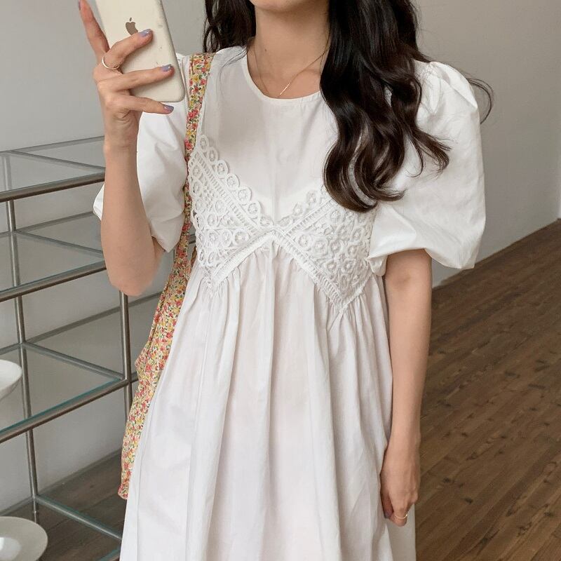 3カラー レース ラウンドネック 半袖 ワンピース *on368