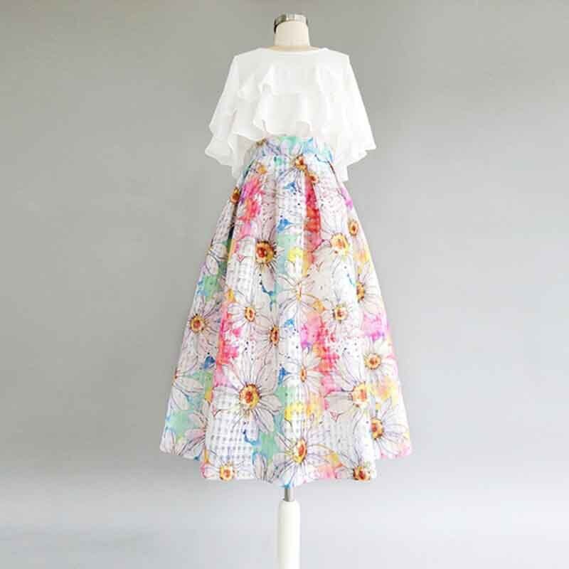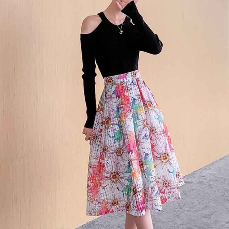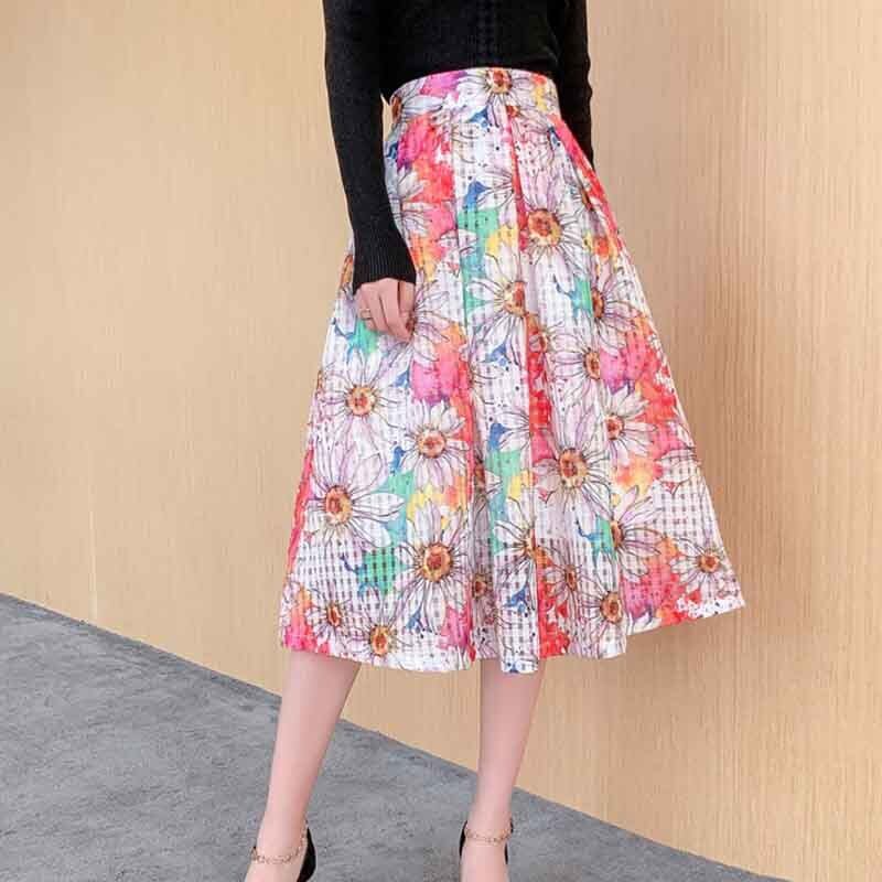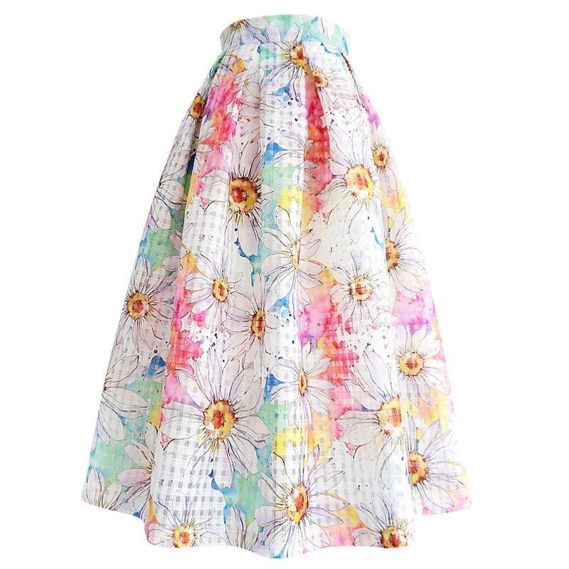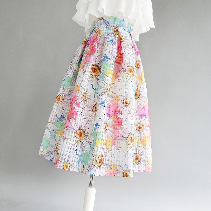 花柄 ハイウエスト チェック Aライン スカート *sk097