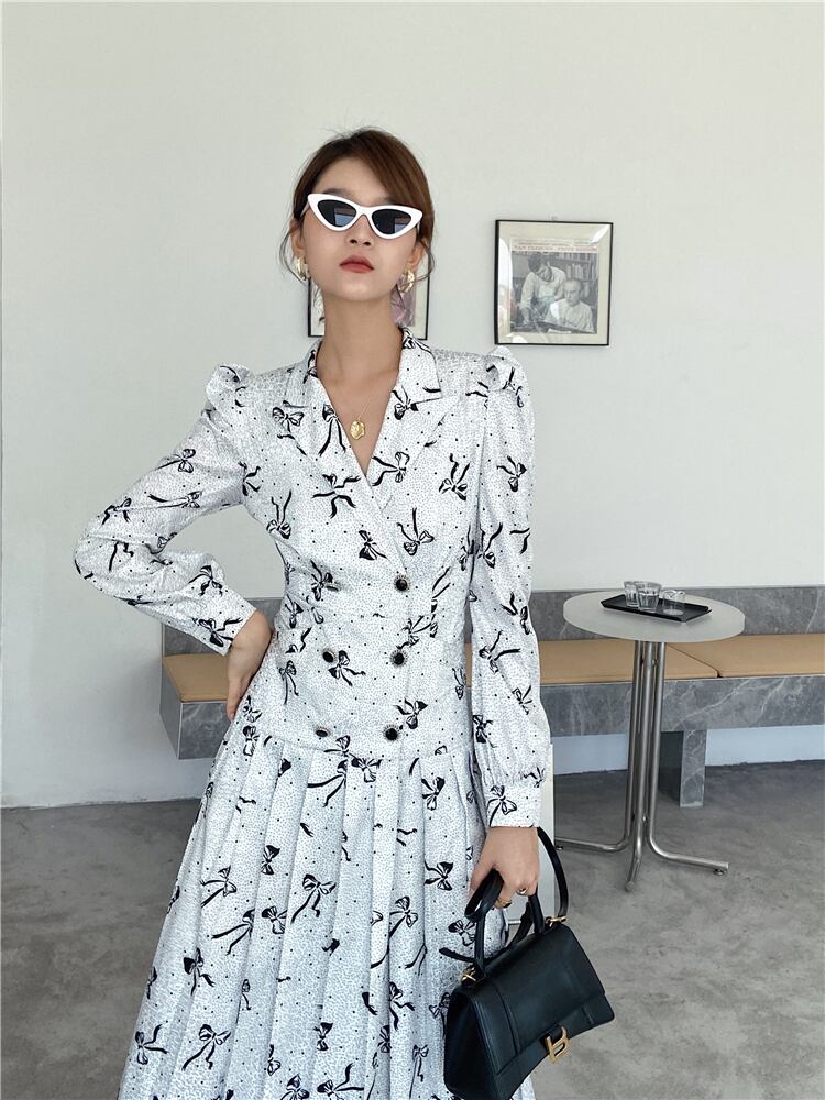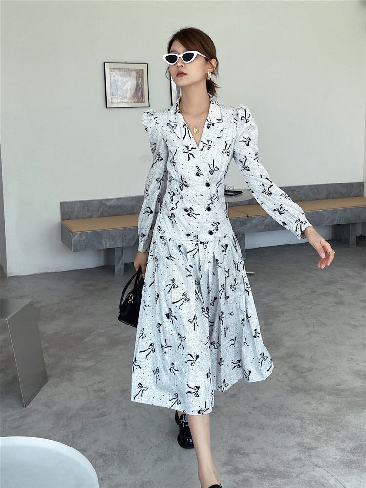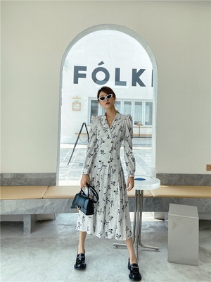 リボン柄 カシュクール シフォン 長袖 ワンピース *on372