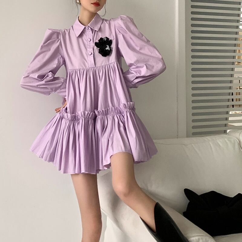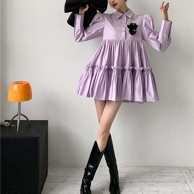 フェミニン ギャザー ミニ丈 長袖 ワンピース *on374