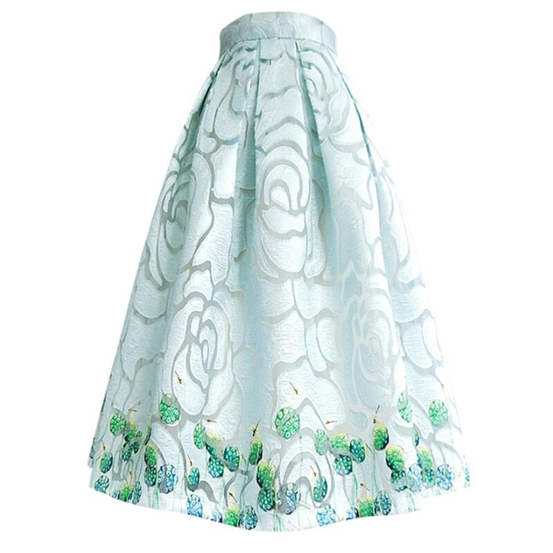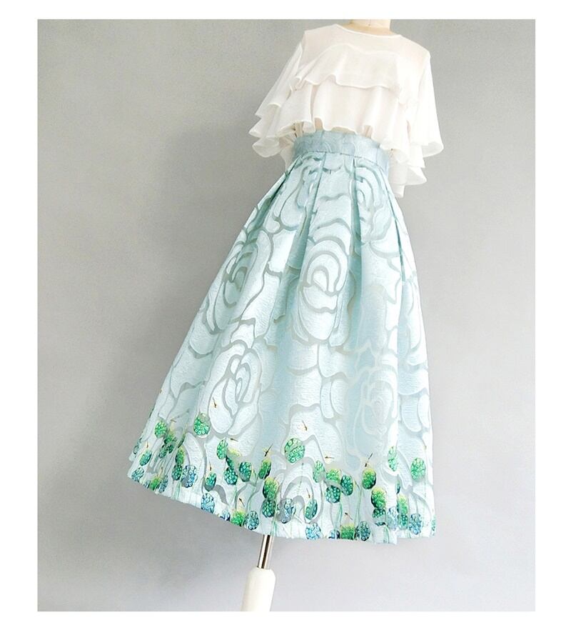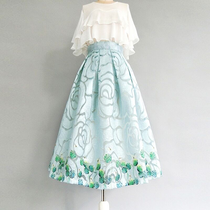 フローラル ハイウエスト シアー Aライン スカート ブルー *sk109