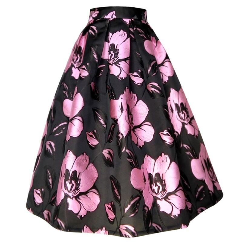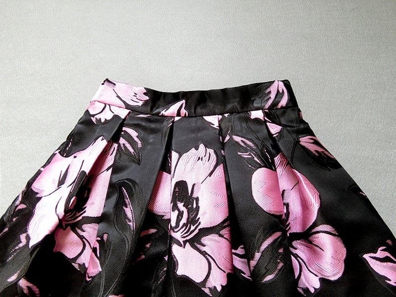 黒地にピンクの花柄が映えるエレガントなスカートです。