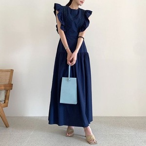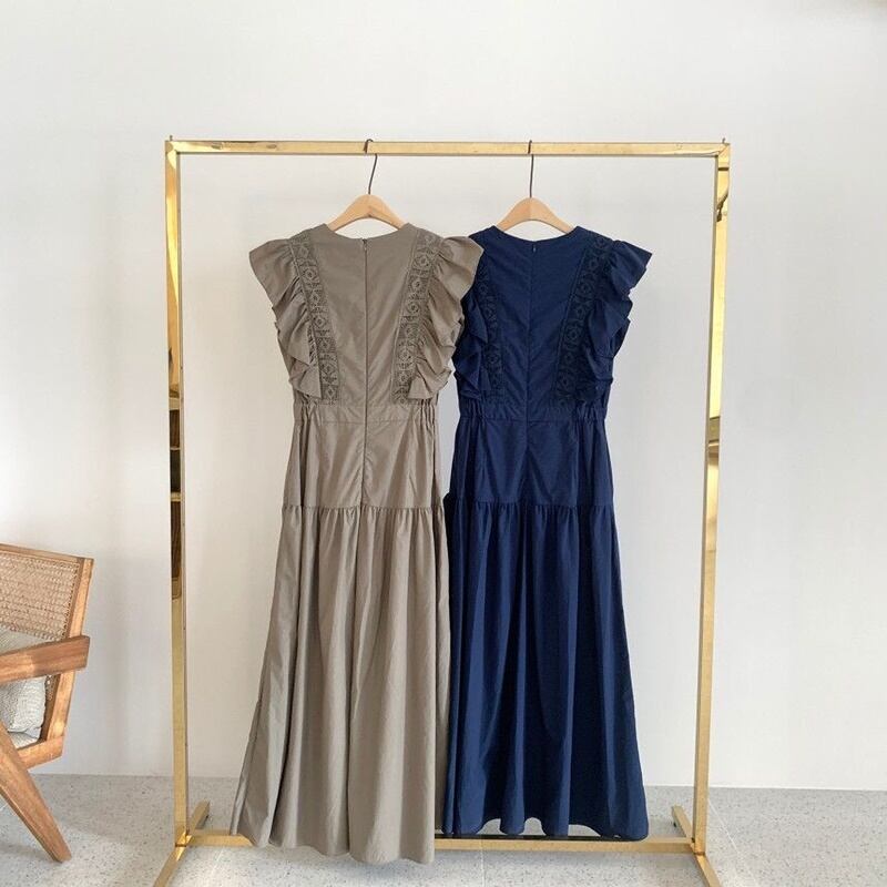 2カラー 肩フリル ラウンドネック ノースリーブ ワンピース *on380