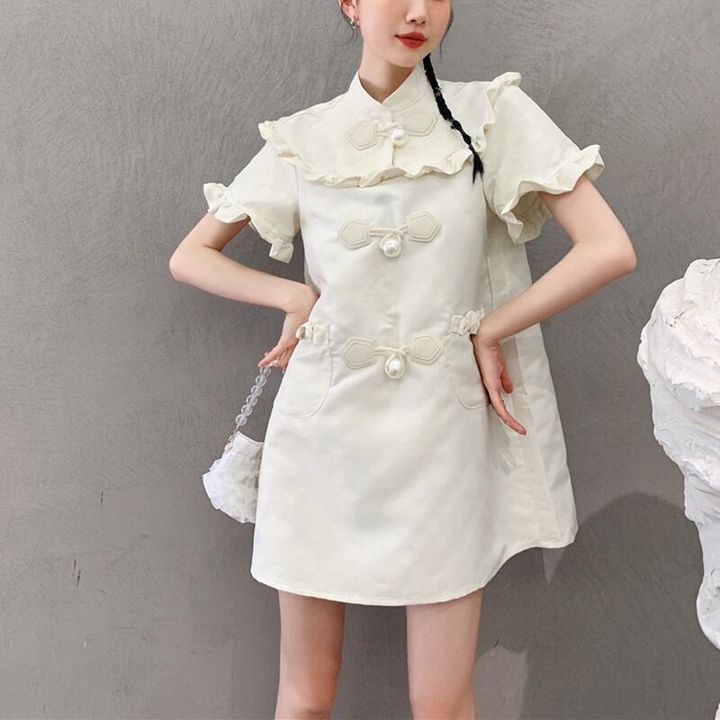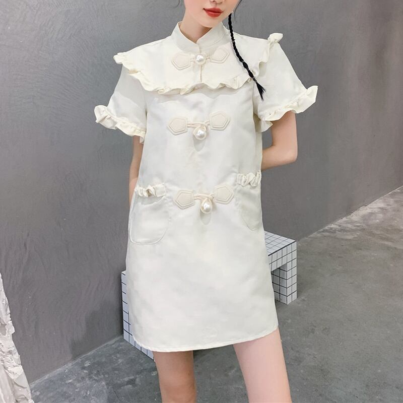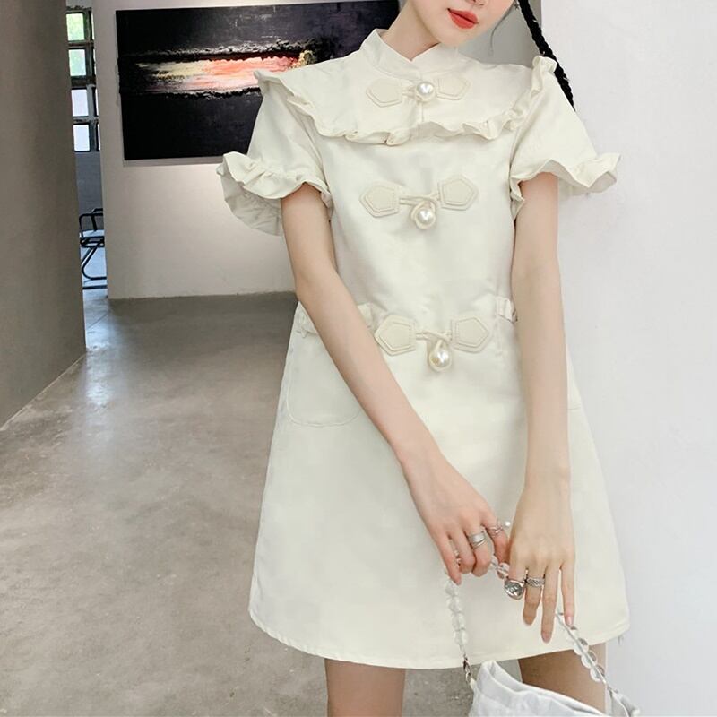 パールボタン フリル ハイネック 半袖 ワンピース *on381