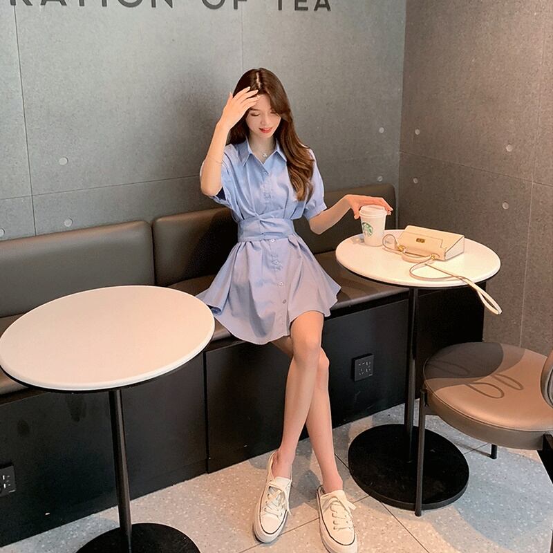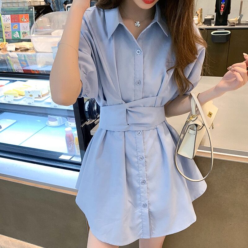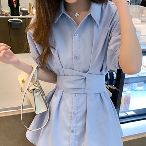 パフスリーブ リボン ベルト 半袖 シャツワンピース *on388