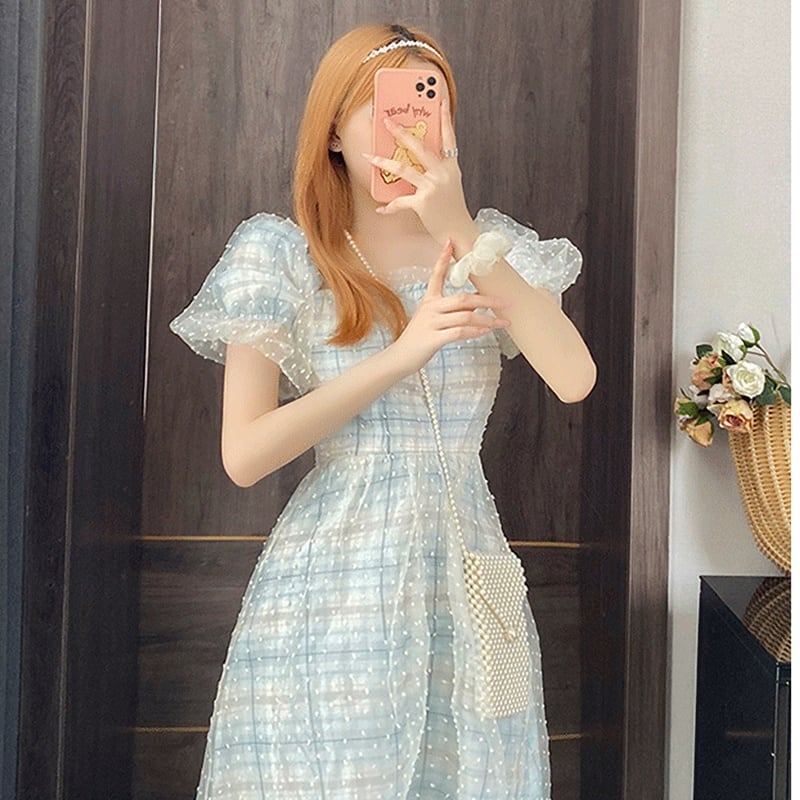 チェック柄 シアー スクエアネック 半袖 ドレス ワンピース *on392