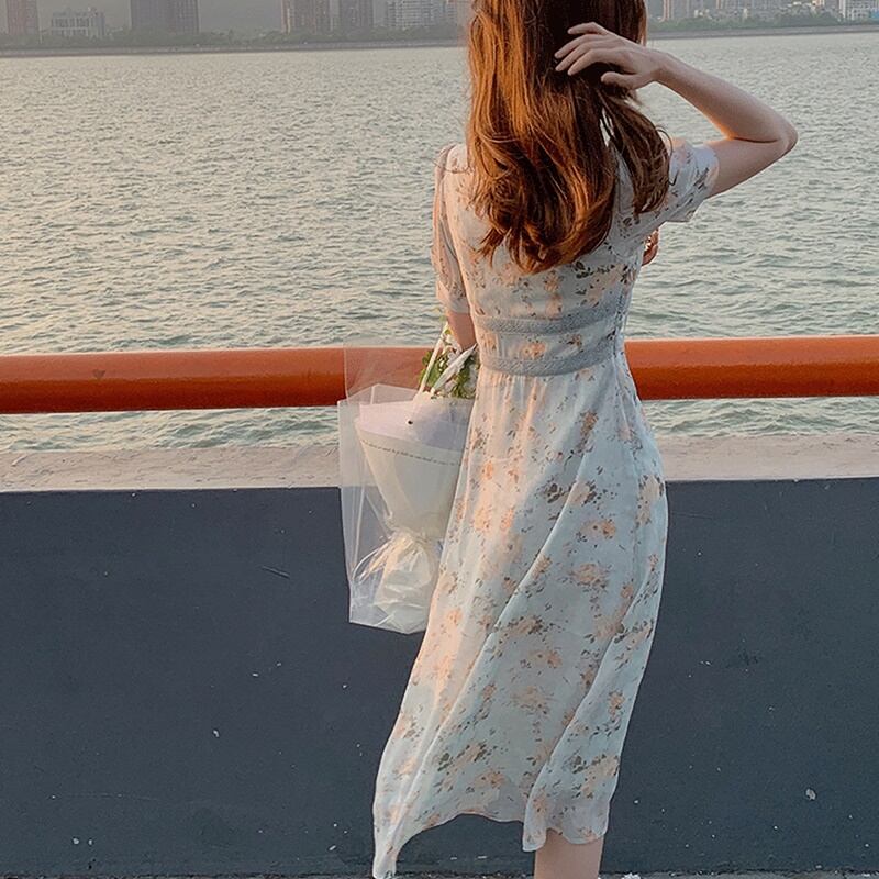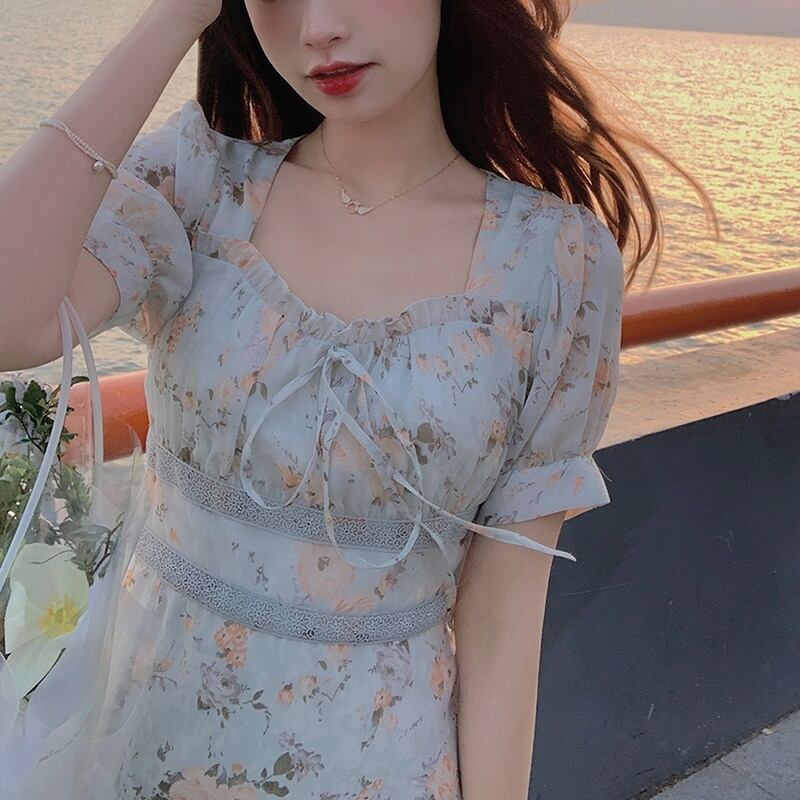 花柄 シフォン レース リボン 半袖 ワンピース *on394