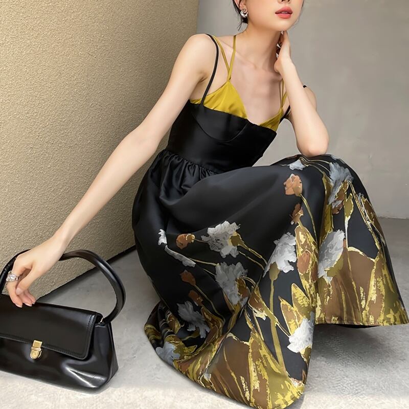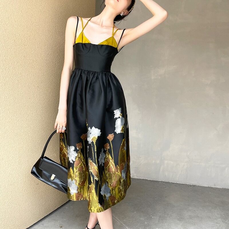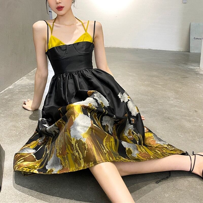 ゴールド柄 キャミソール ノースリーブ ワンピース *on413