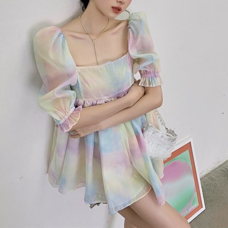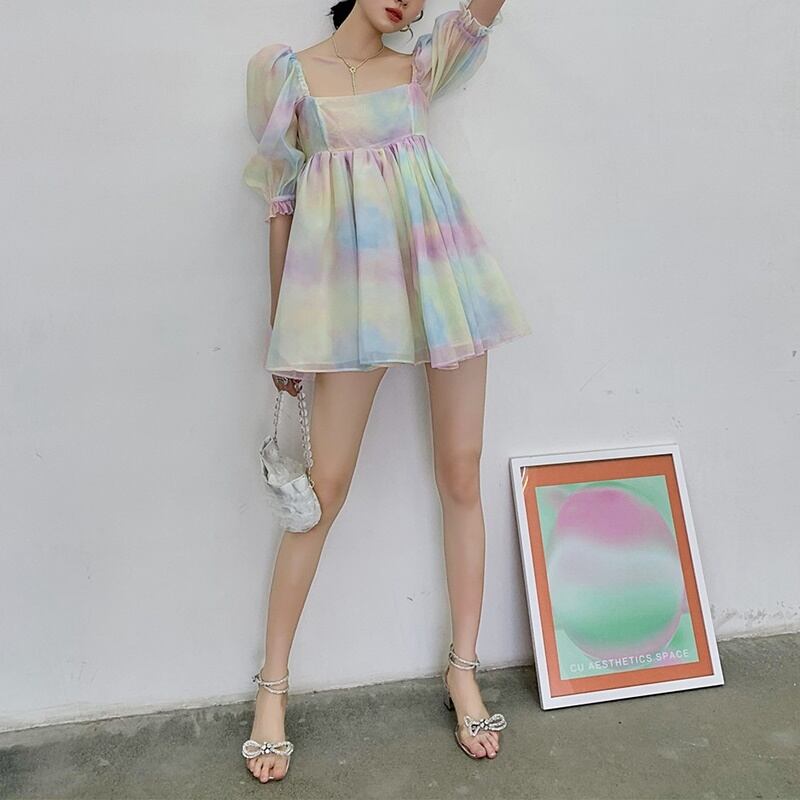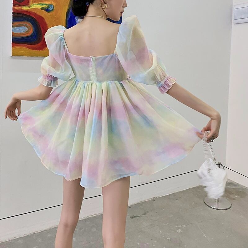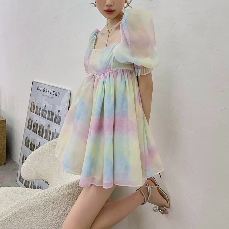 シフォン スクエアネック 半袖 ワンピース 虹色 *on429