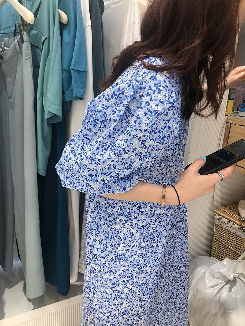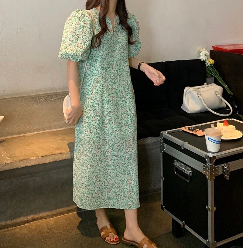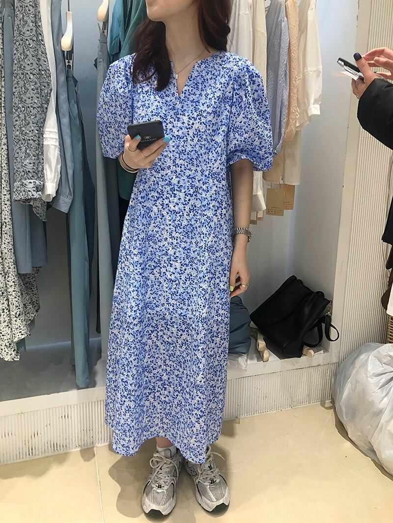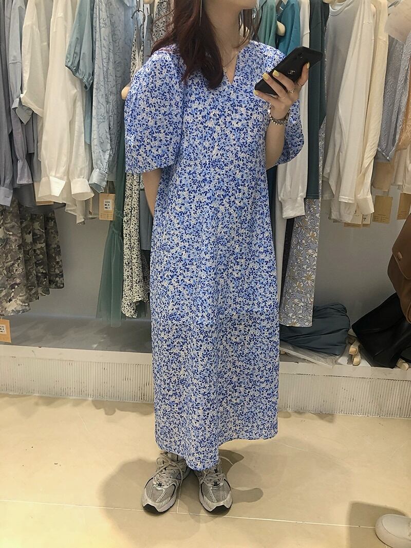 3カラー 花柄 Vネック パフスリーブ 半袖 ワンピース *on434