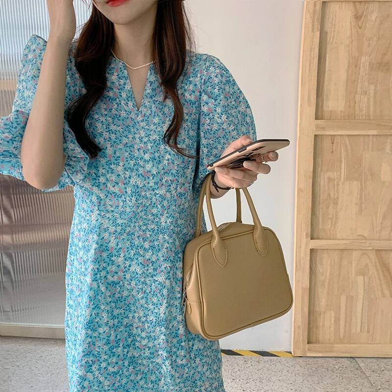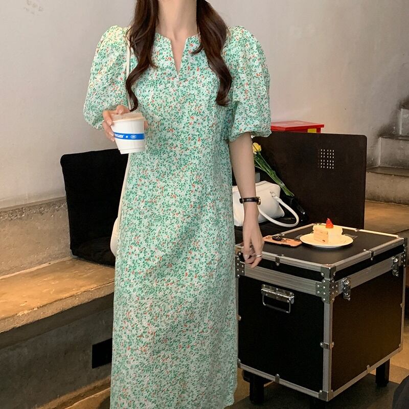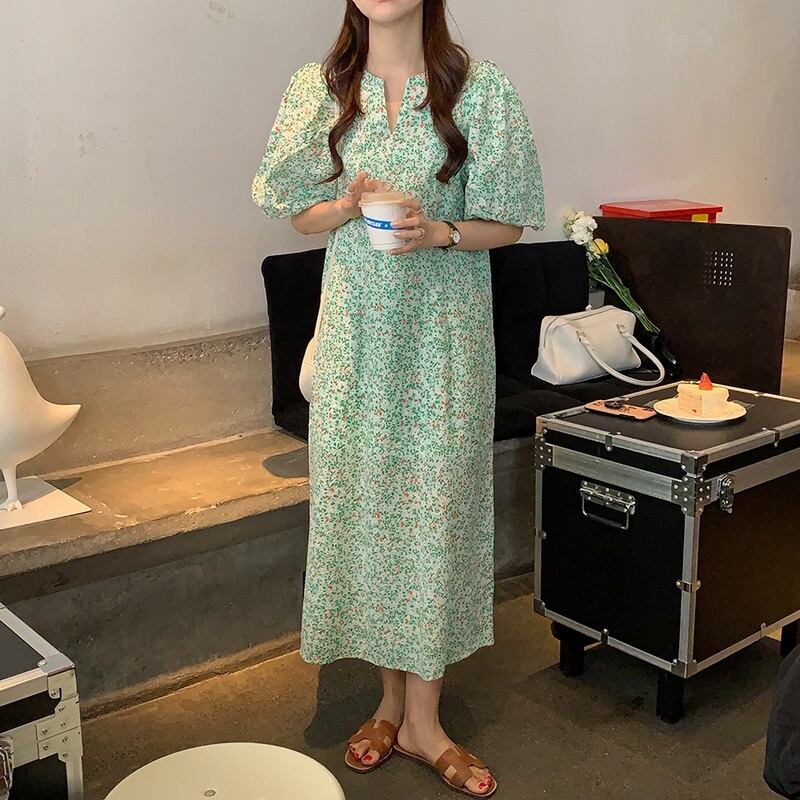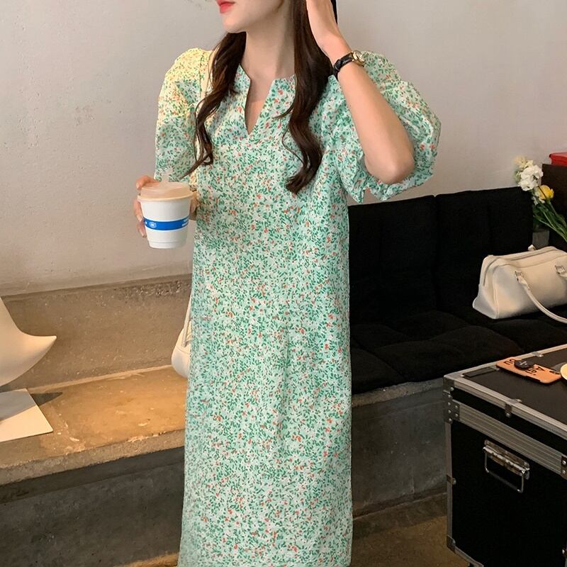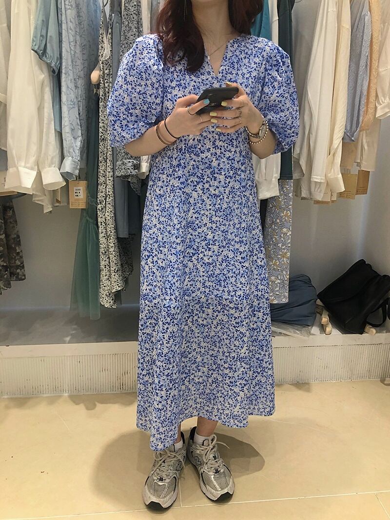 3カラー 花柄 Vネック パフスリーブ 半袖 ワンピース *on434