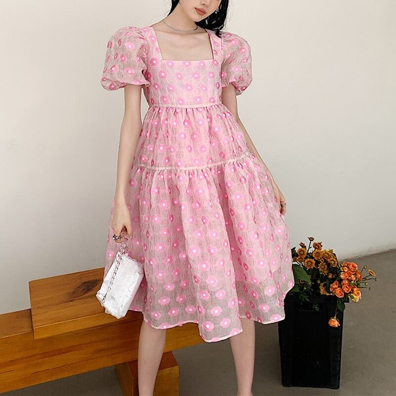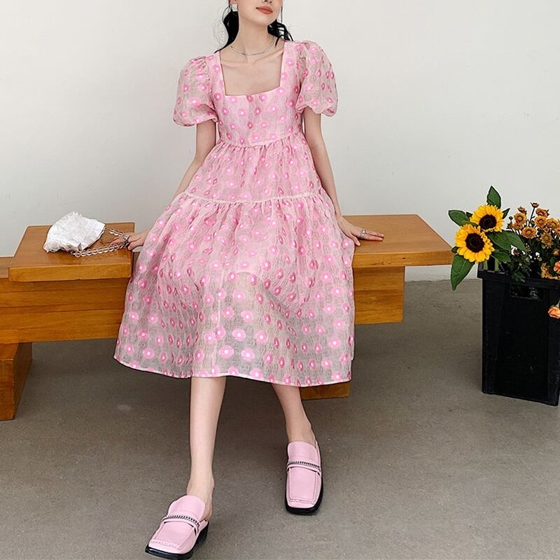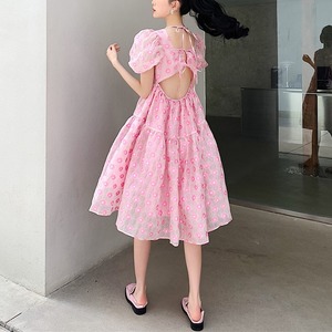 バックオープン リボン 花柄 半袖 ドレス ワンピース *on460