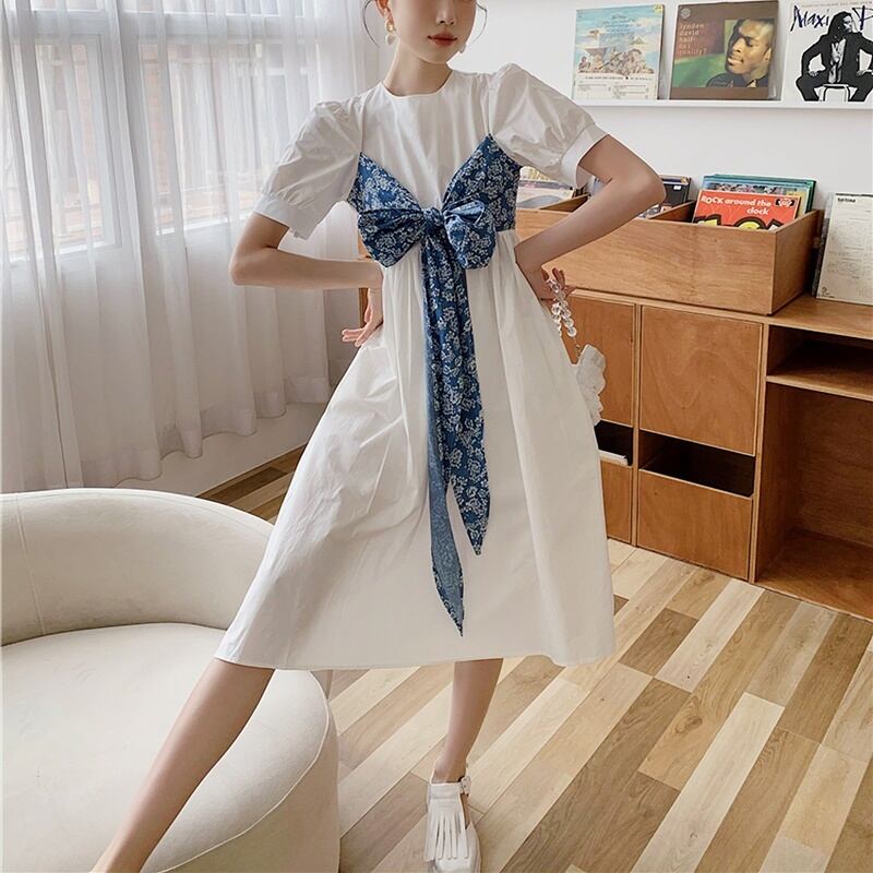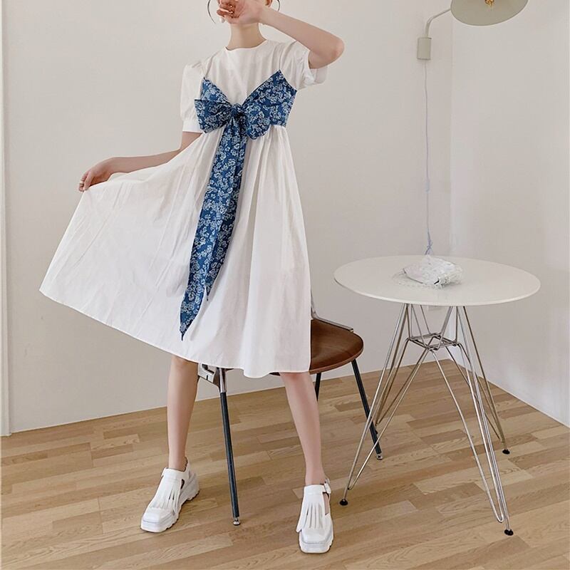 リボン ラウンドネック 半袖 ドレス ワンピース *on463
