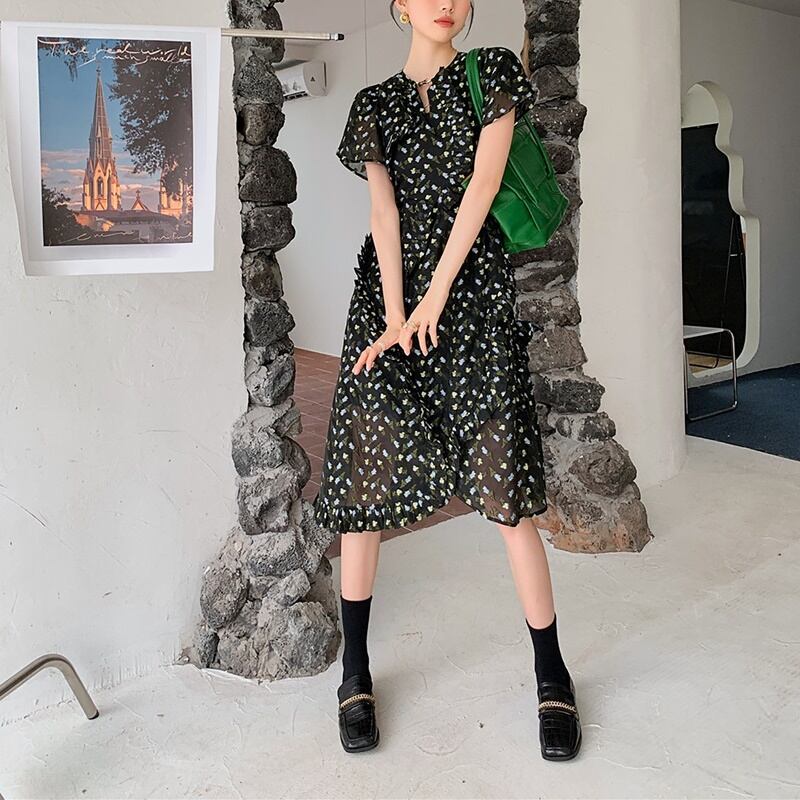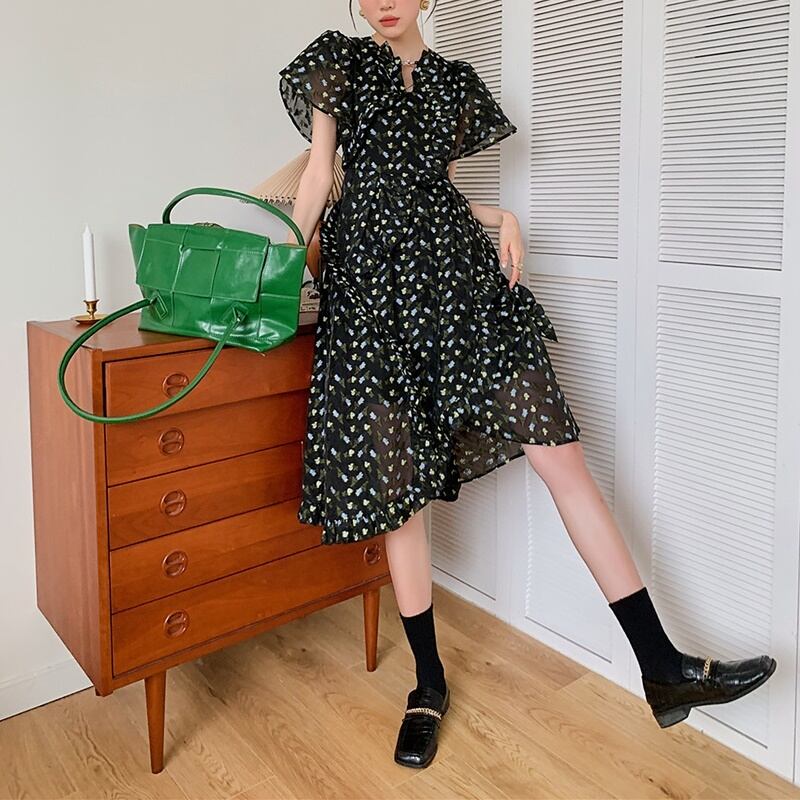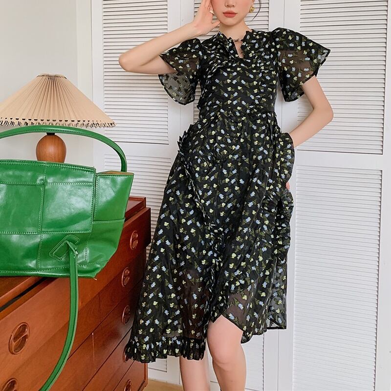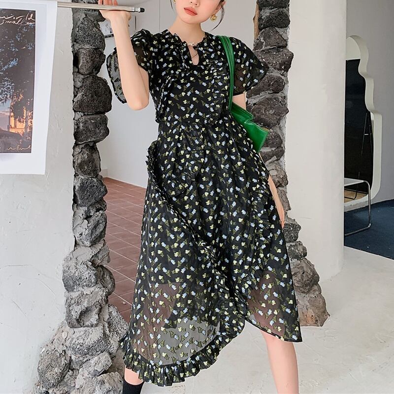 花柄 シアー シフォン フリル 半袖 ワンピース *on462