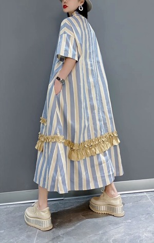 2カラー ストライプ フリル 半袖 シャツワンピース *on470