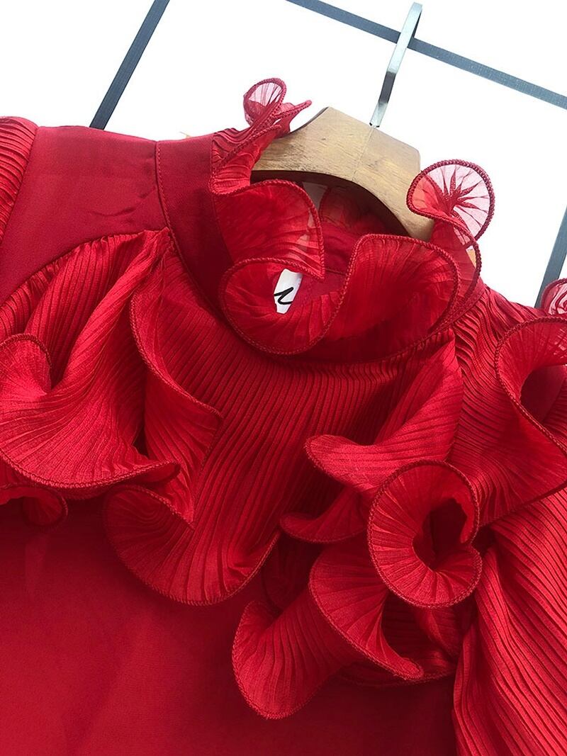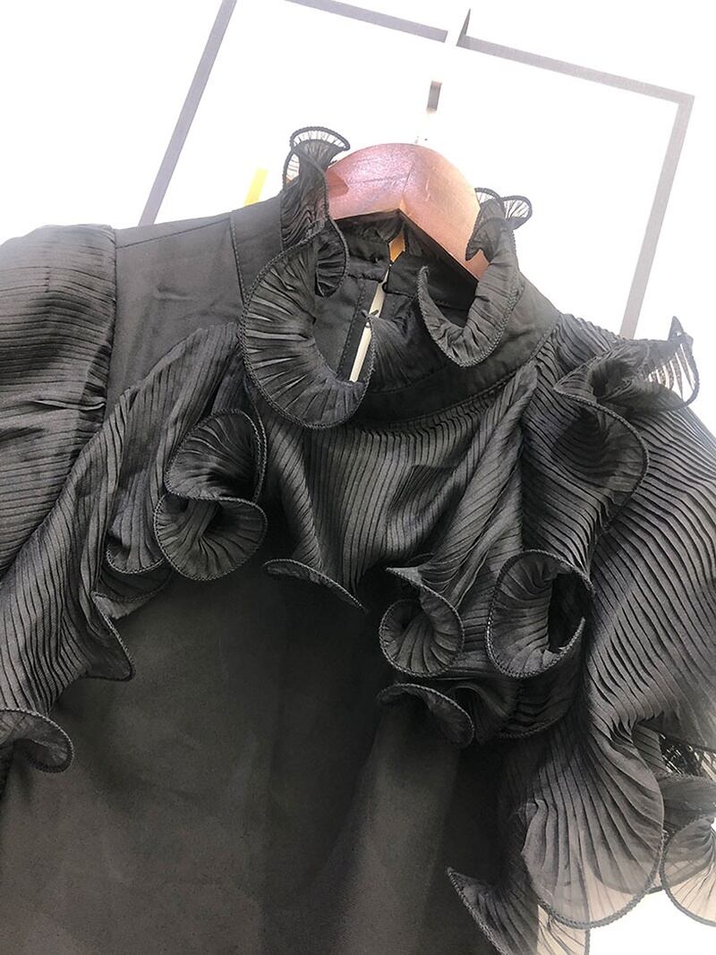 フリルを重ねた立体感のあるフリルワークが目を引くブラウスです。