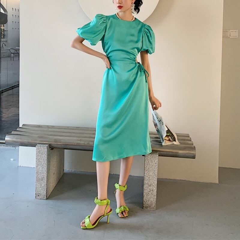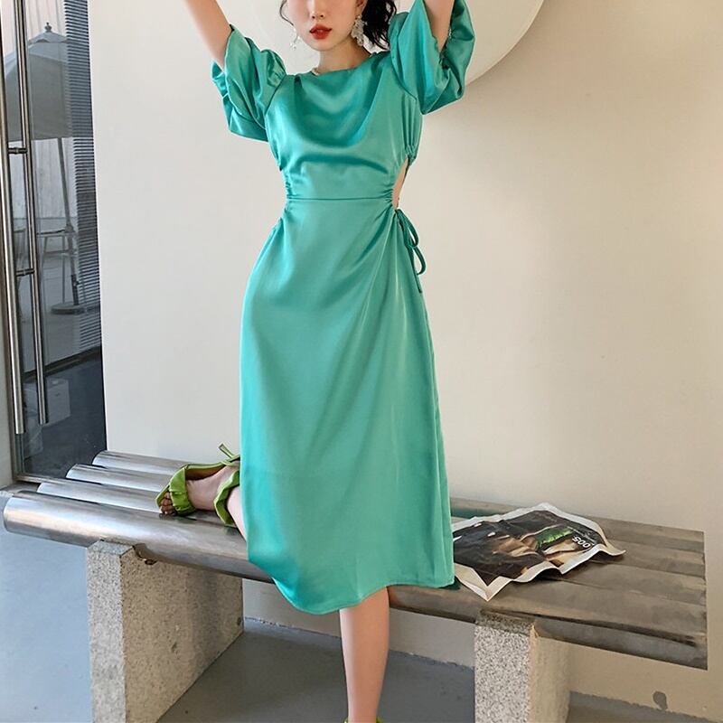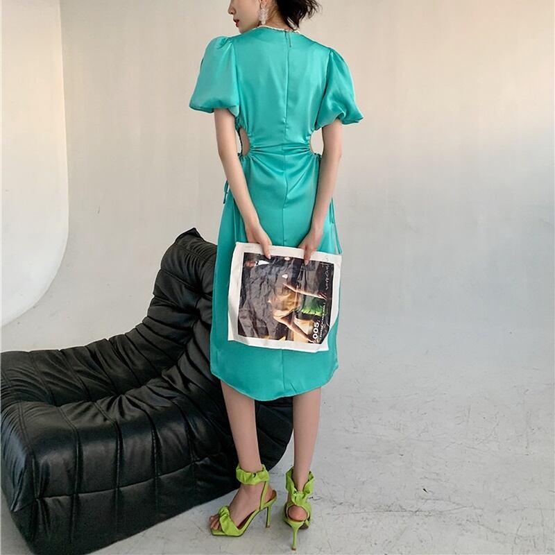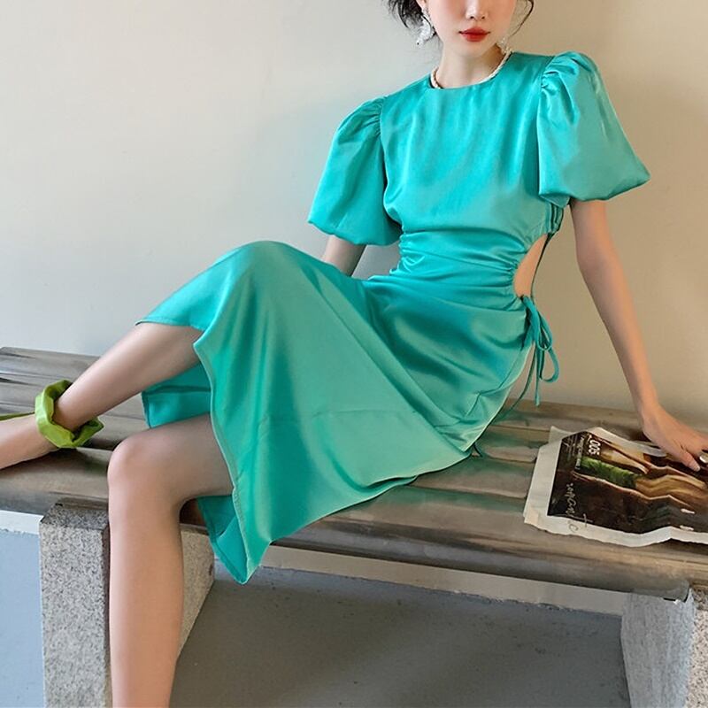 ラウンドネック サイドオープン パフスリーブ 半袖 ワンピース * on474