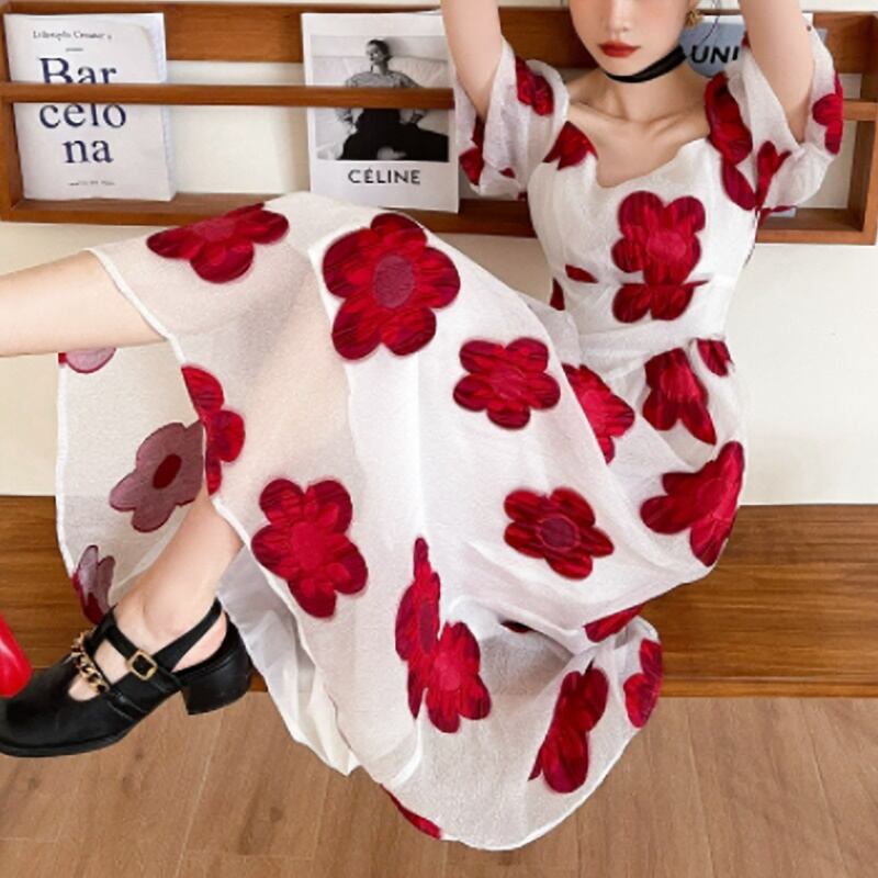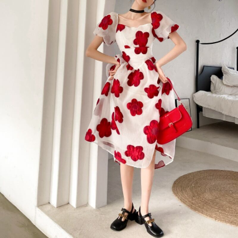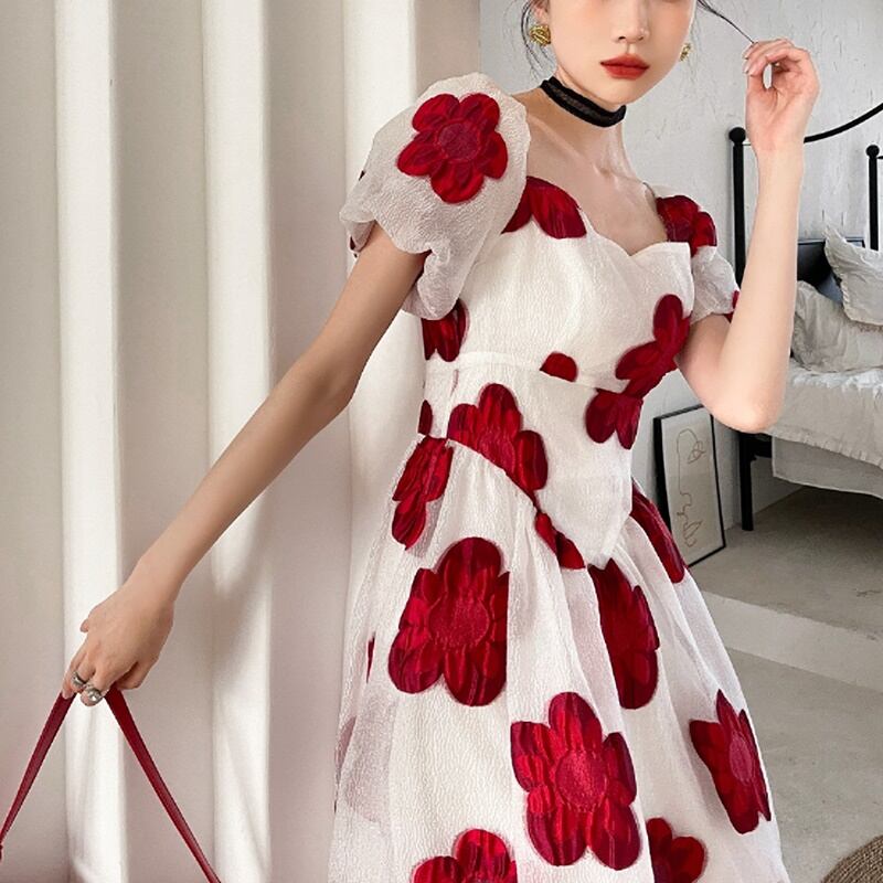 スクエアネック 花柄 パフスリーブ 半袖 ワンピース *on475