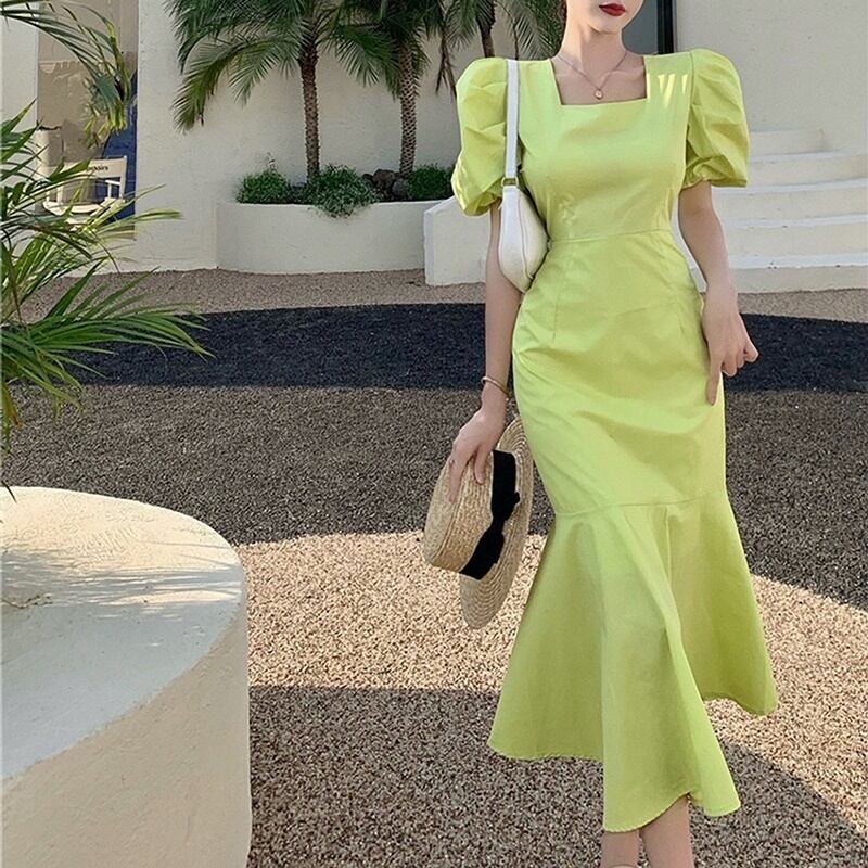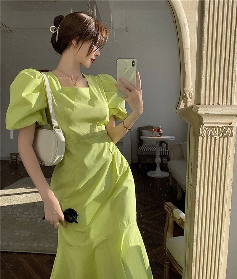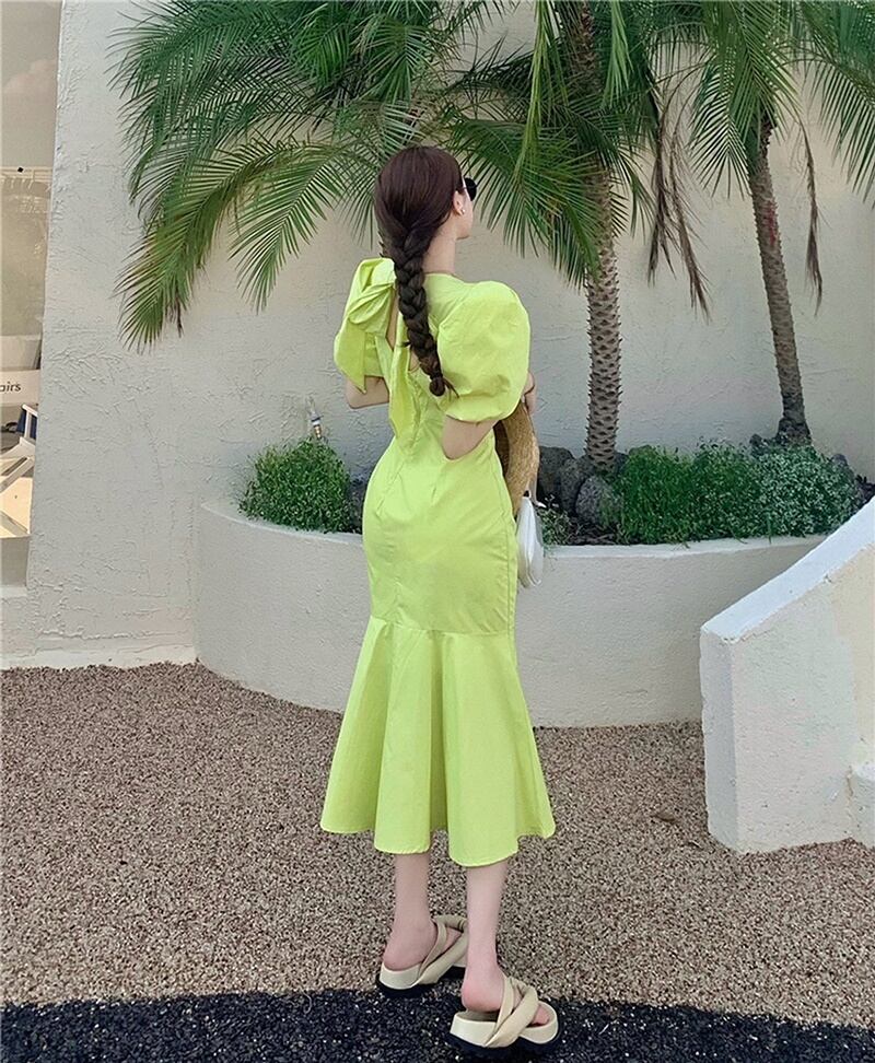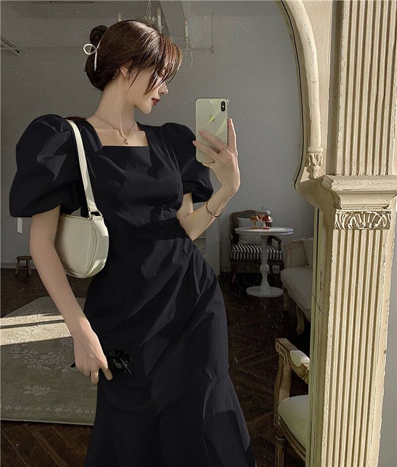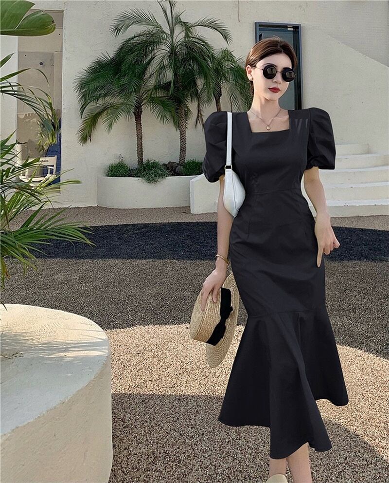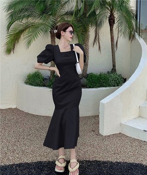 2カラー スクエアネック マーメイド 半袖 ワンピース *on476