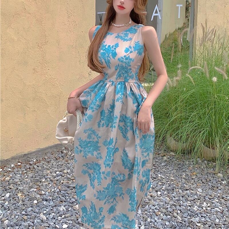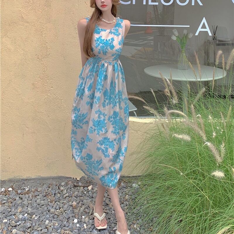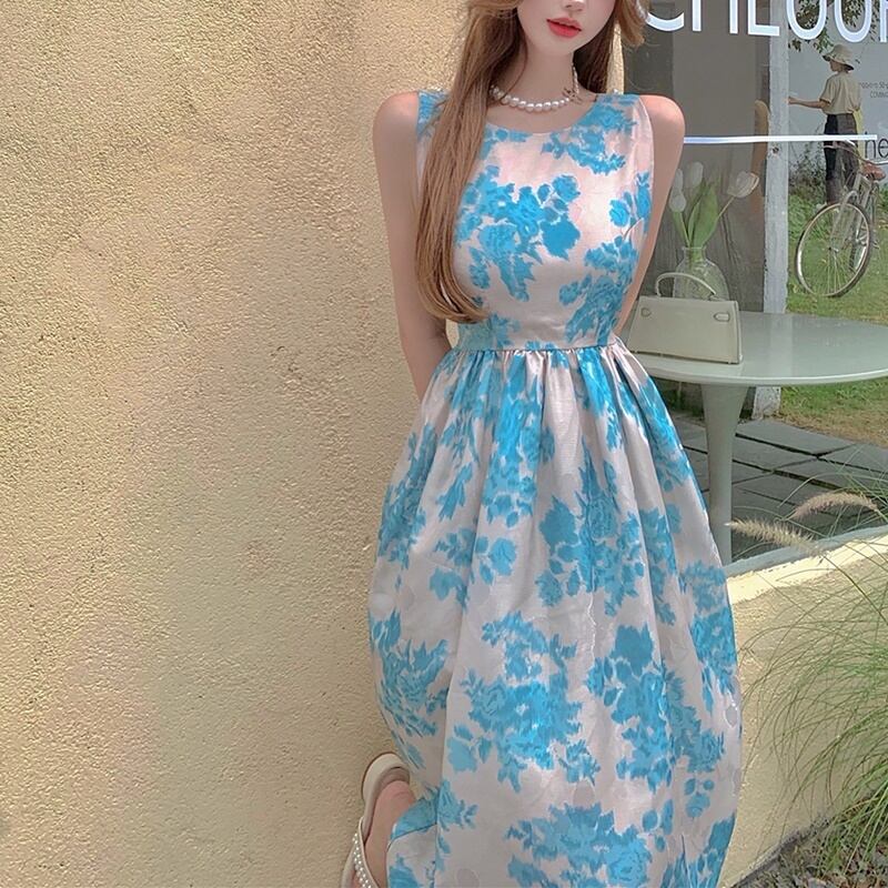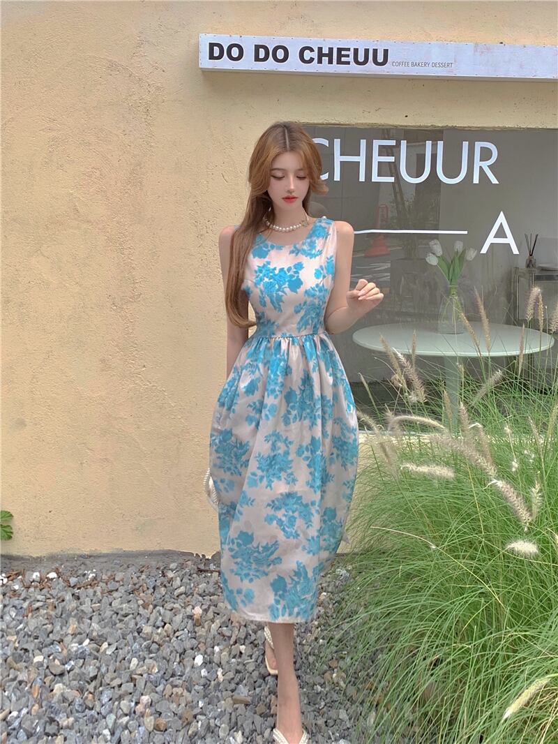 花柄 ラウンドネック リボン ノースリーブ ワンピース *on478