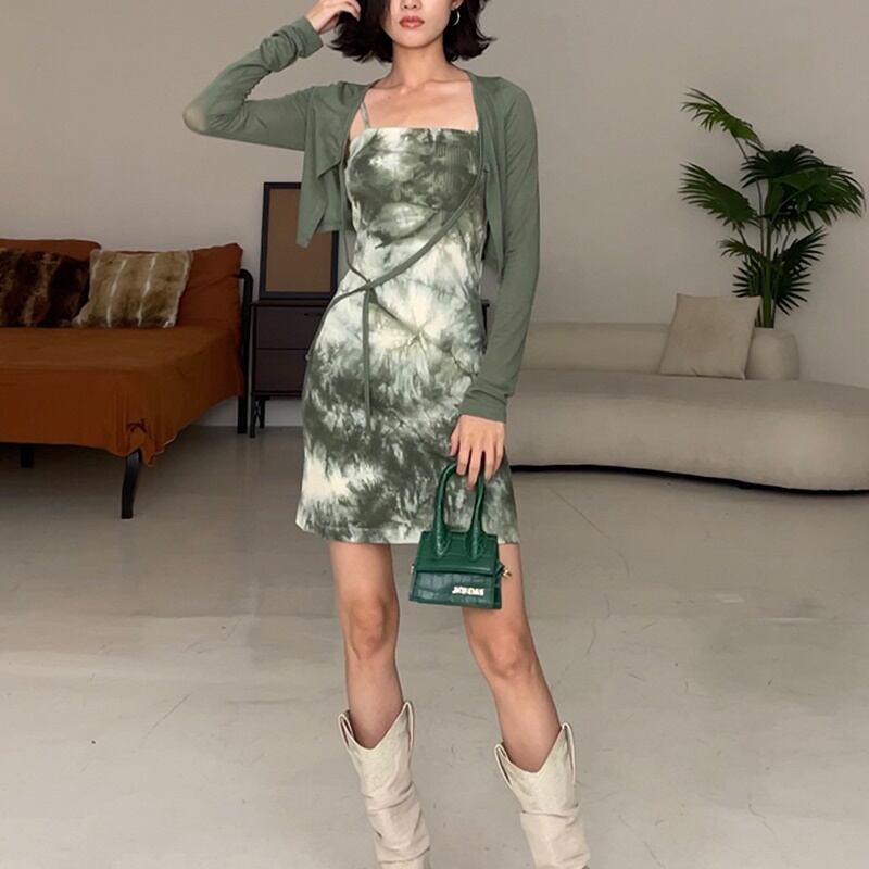 絞り染め風 スクエアネック ノースリーブ ワンピース *on480