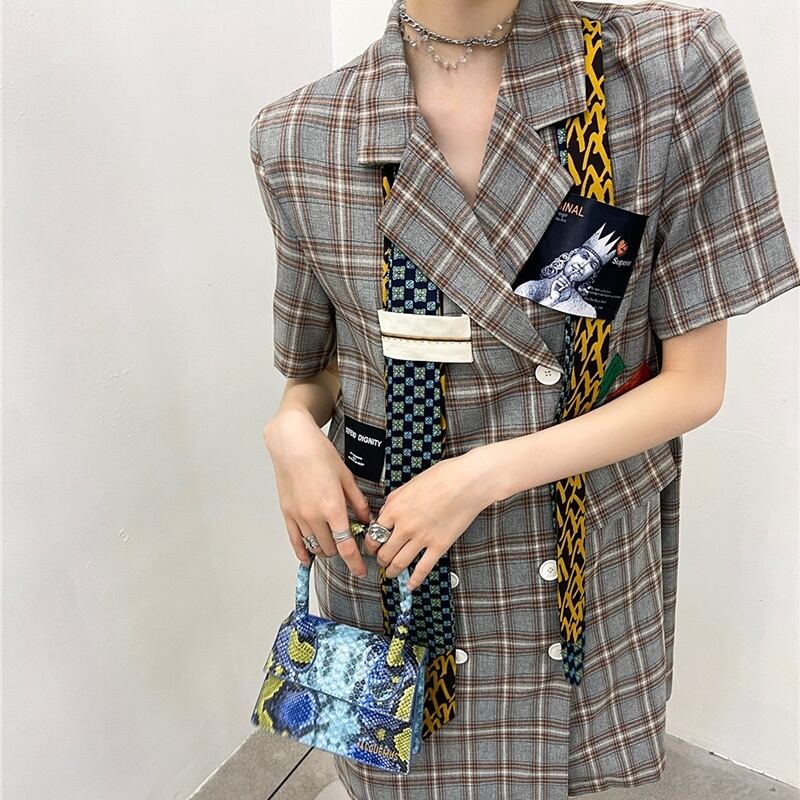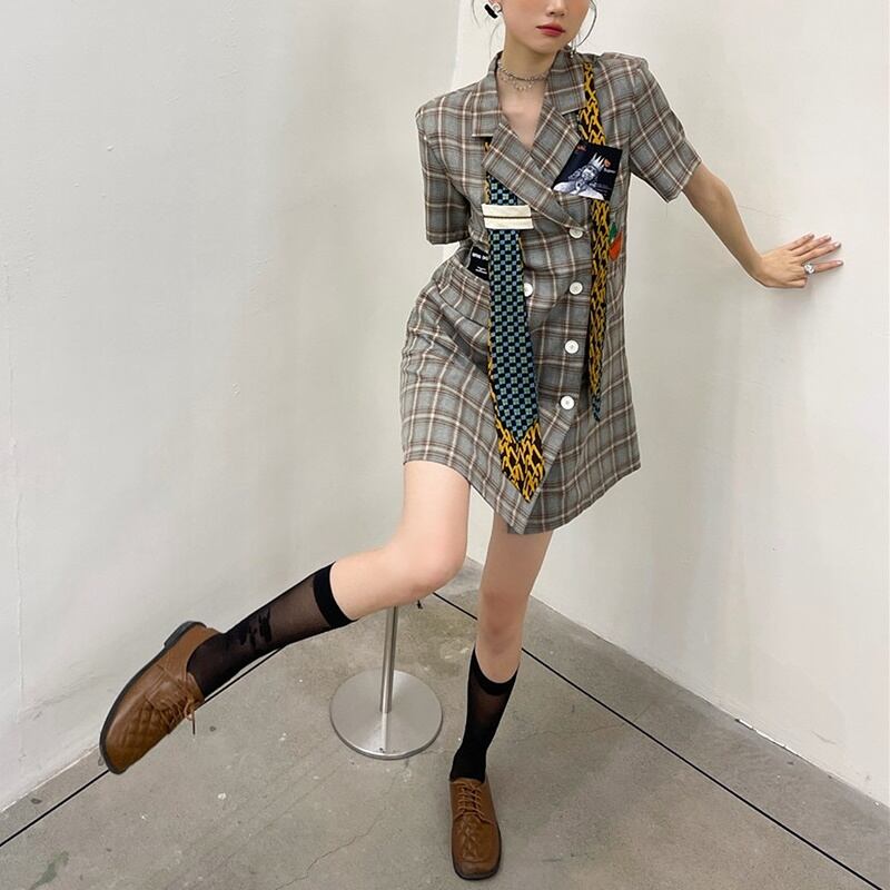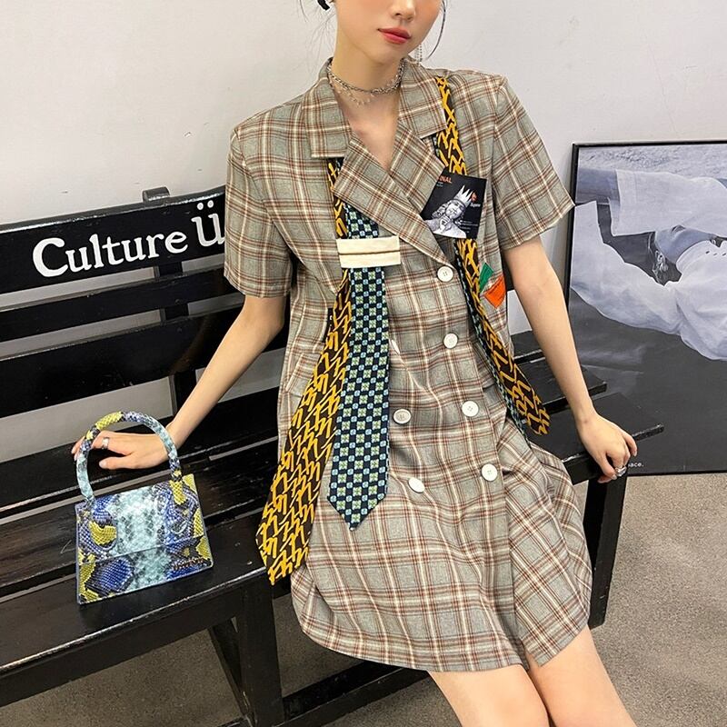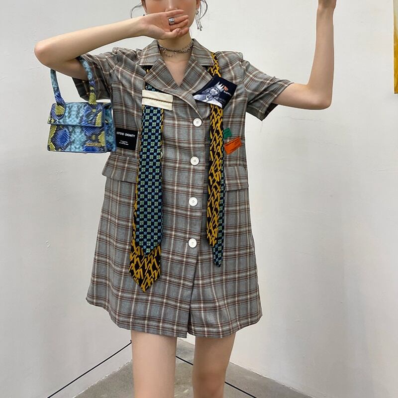 チェック柄 ネクタイ 半袖 シャツワンピース *on496