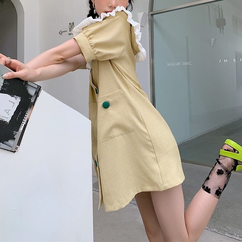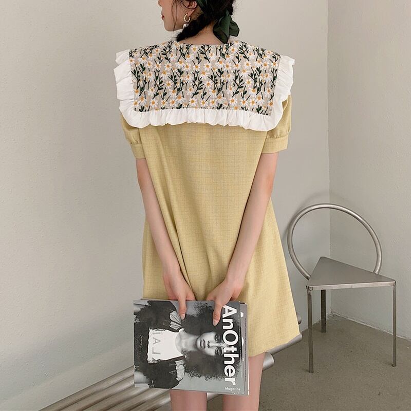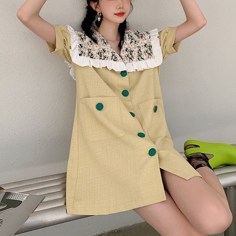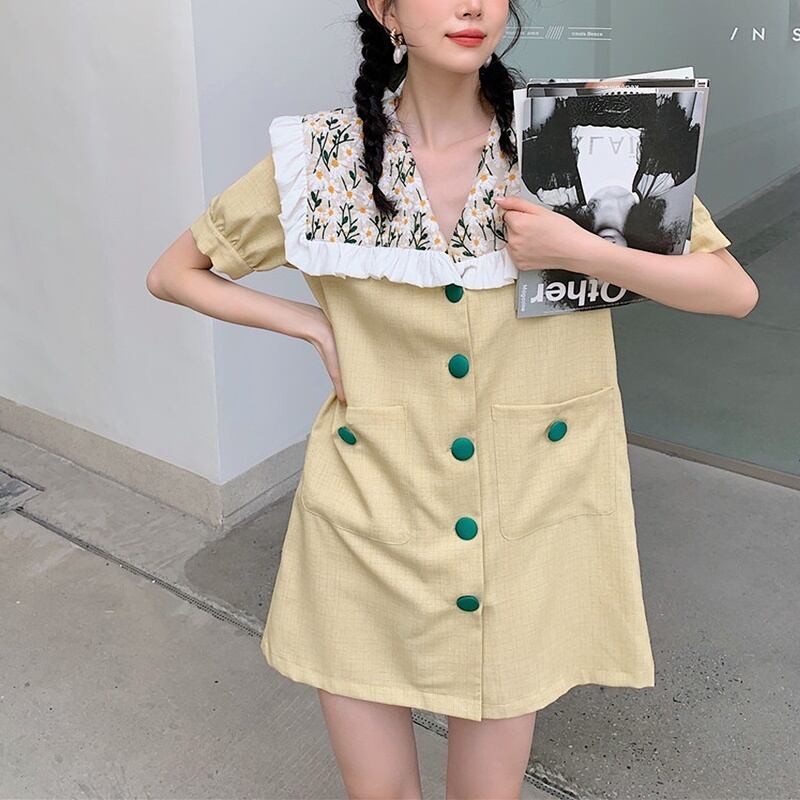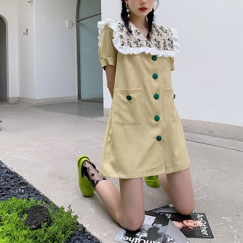花柄 ビッグカラー フリル 半袖 ワンピース *on497