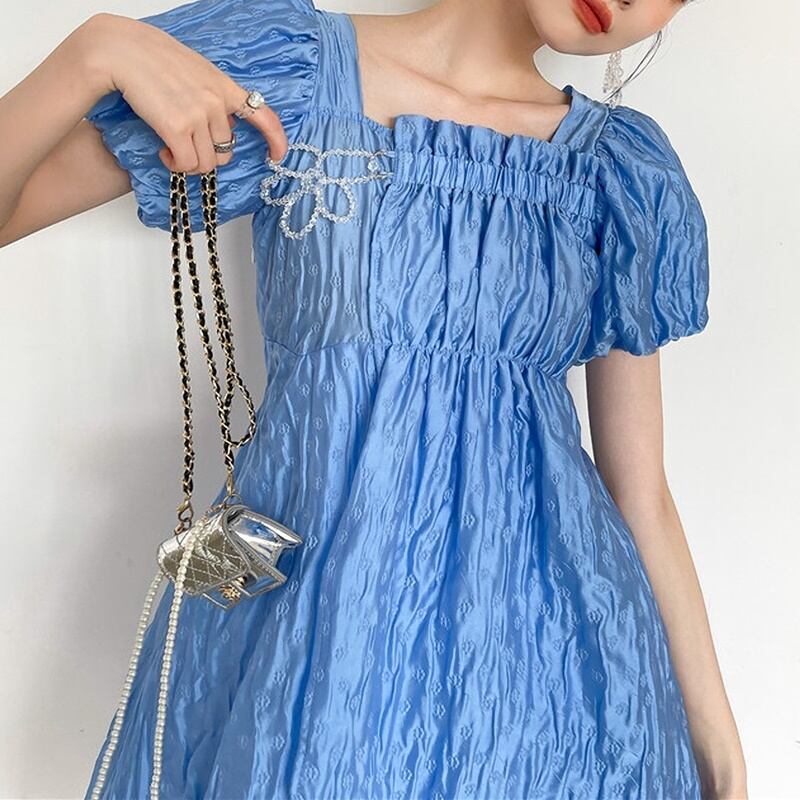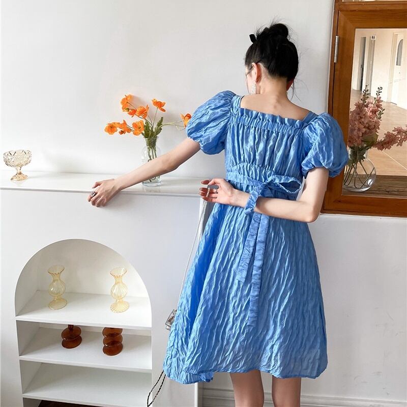 くしゅっとした生地が特徴の半袖ワンピースです。