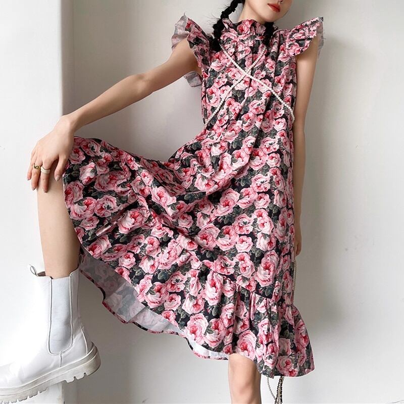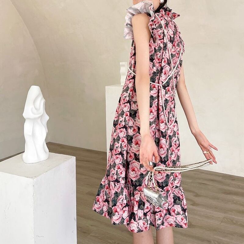 花柄 薔薇 フリル ハイネック ワンピース *on502