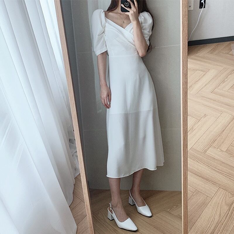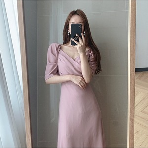 2カラー シフォン シアー Vネック 半袖 ワンピース *on509