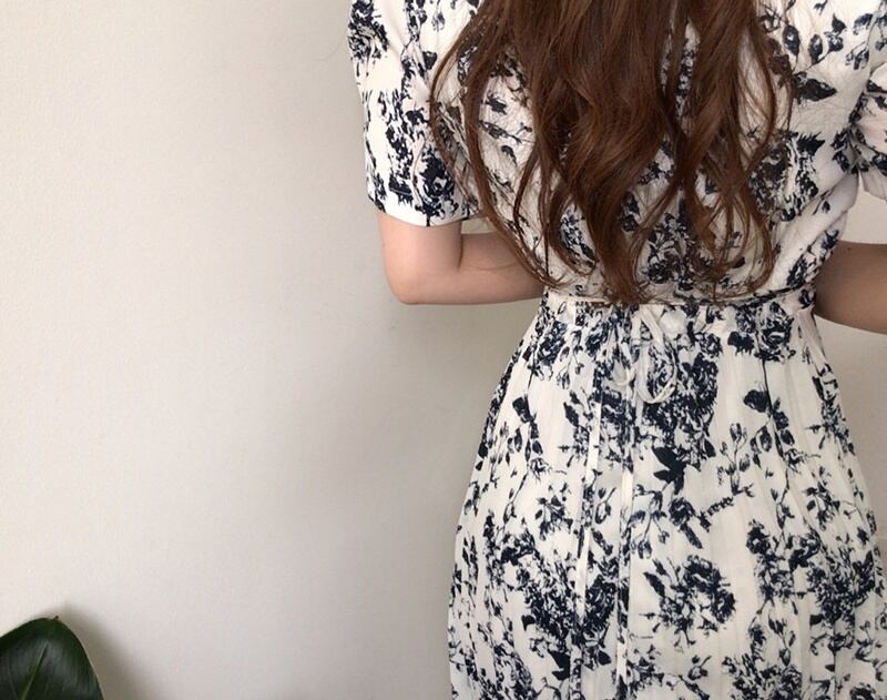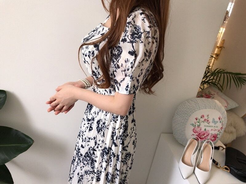 花柄 プリーツ スクエアネック 半袖 ワンピース *on522