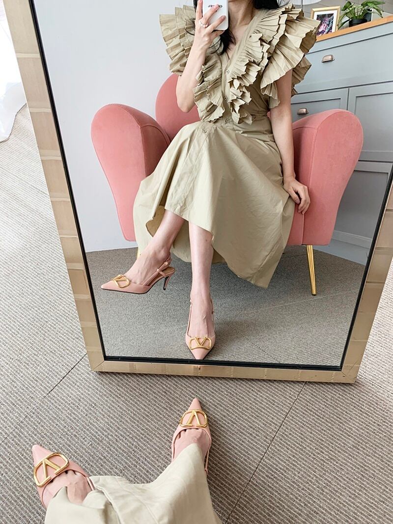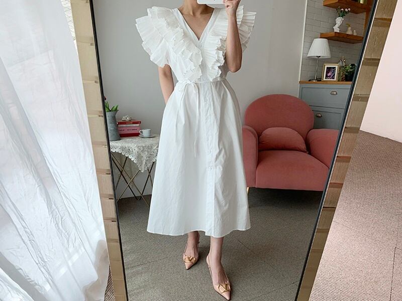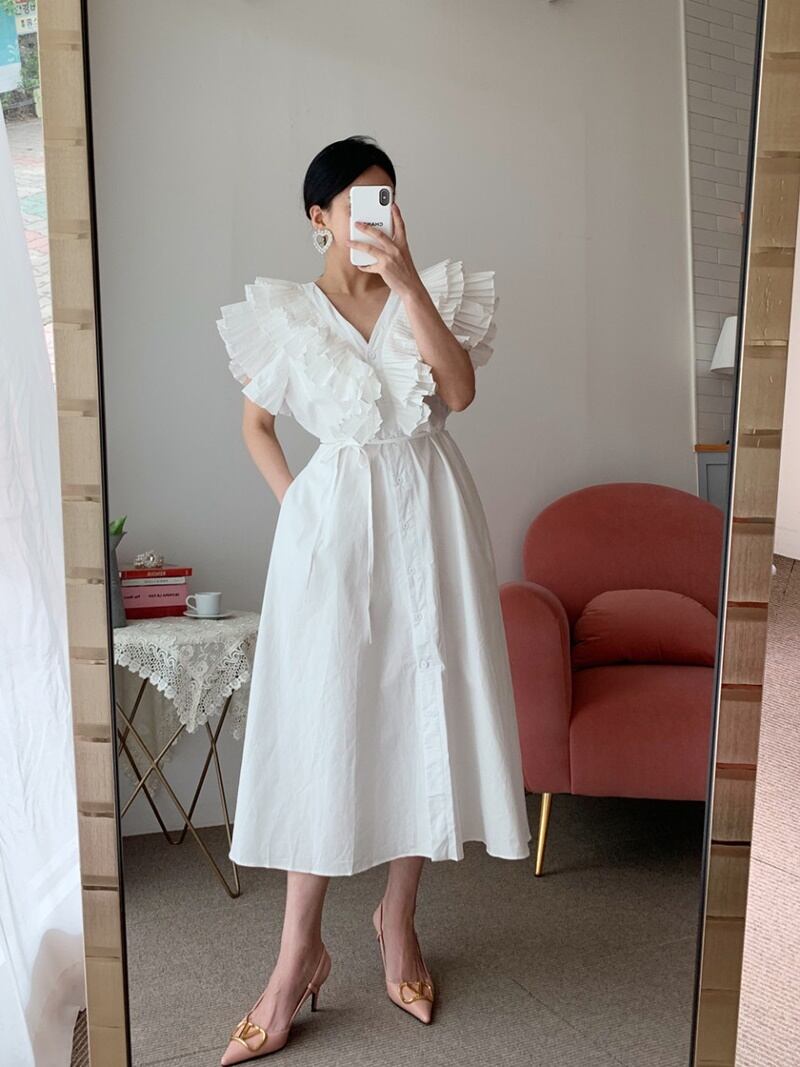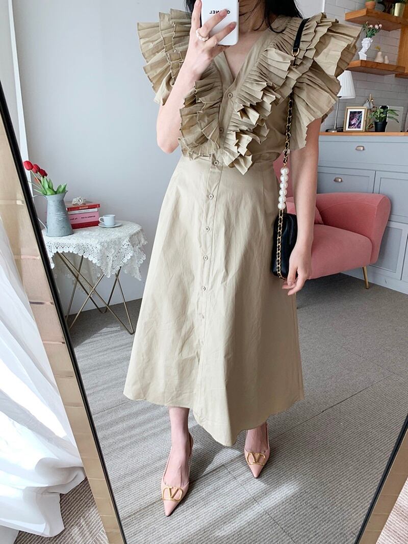 3カラー フリル Vネック 半袖 ワンピース *on530