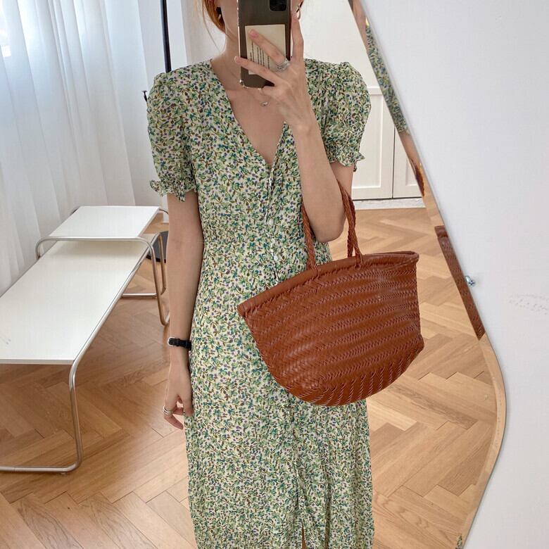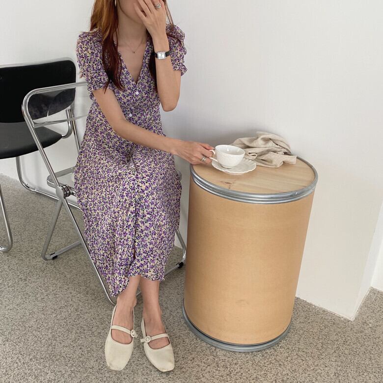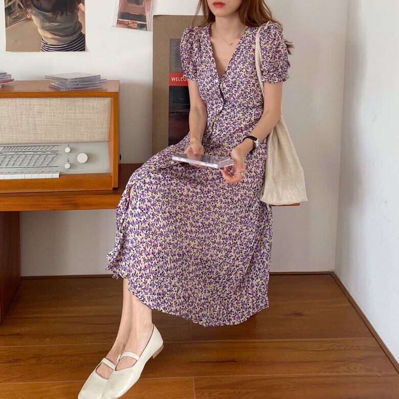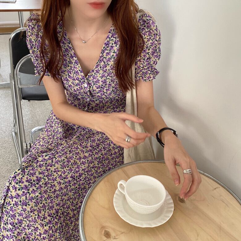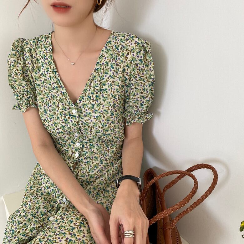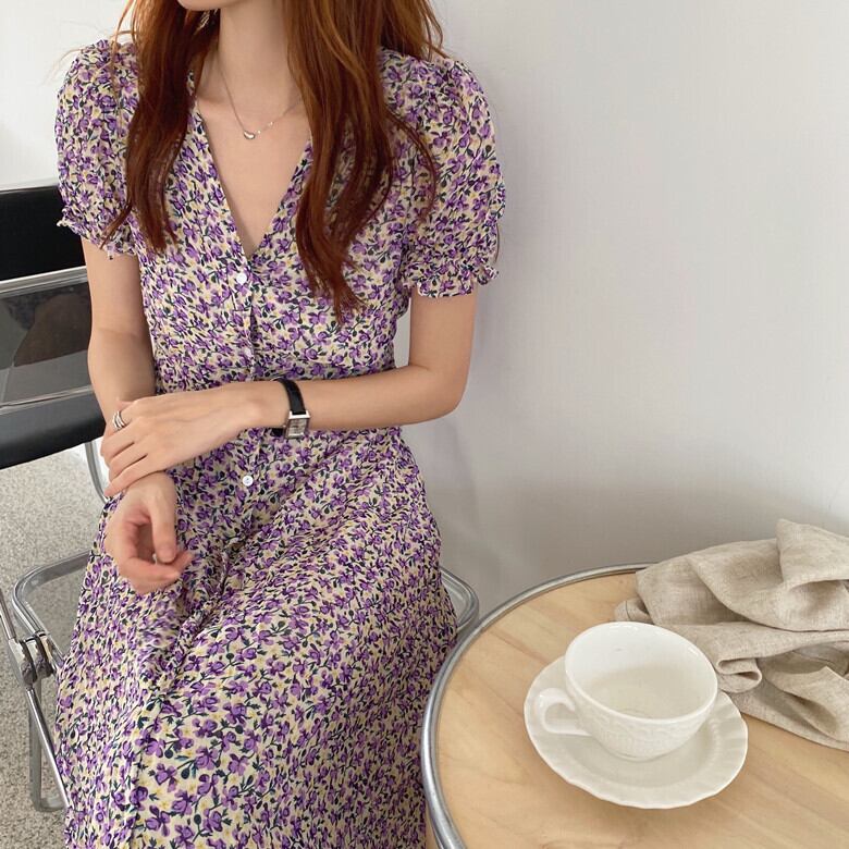 2カラー 花柄 Vネック シフォン 半袖 ワンピース *on532