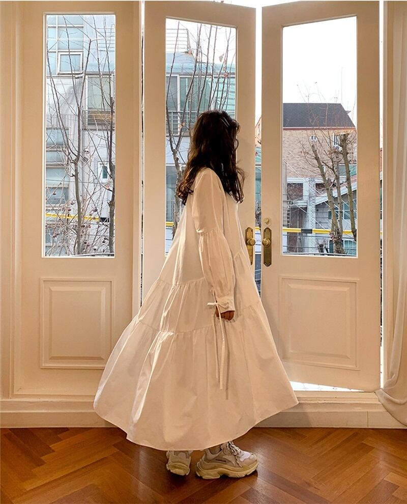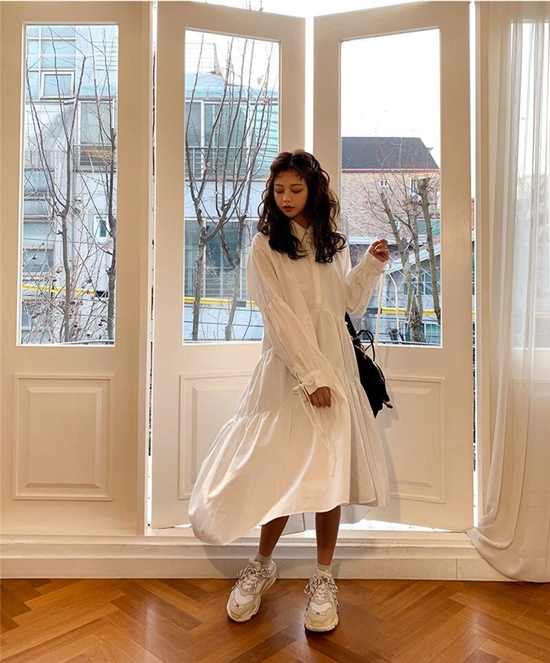 ギャザー リボン 長袖 ドレス シャツワンピース *on534