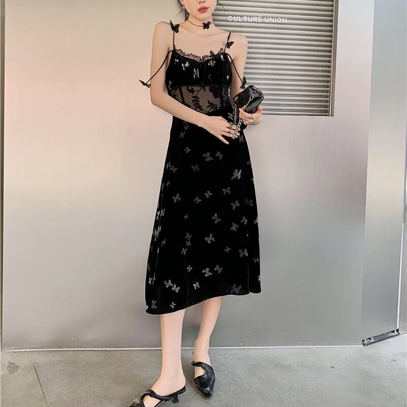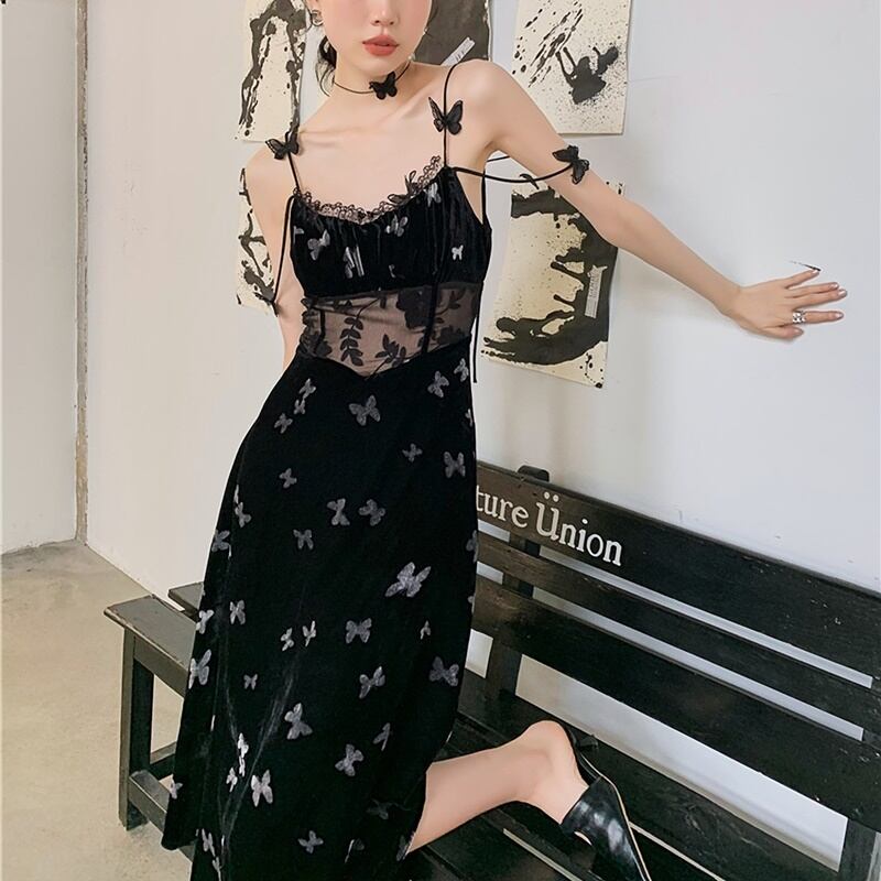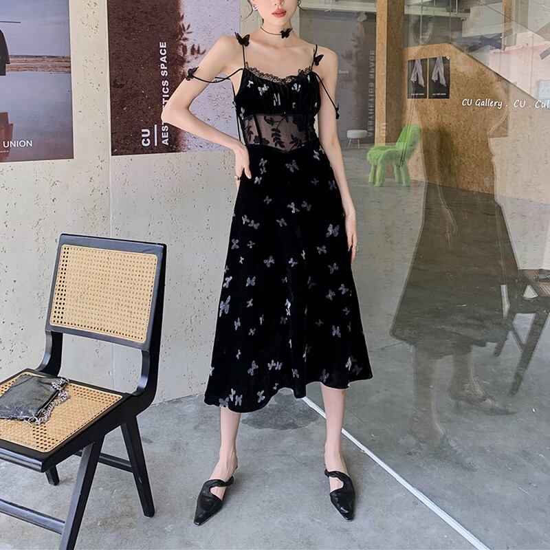 蝶柄 シアー ドレス ノースリーブ ワンピース *on540
