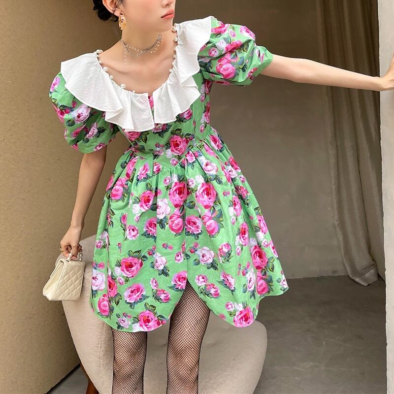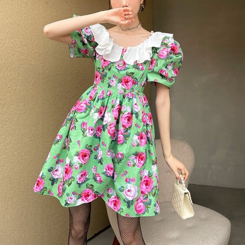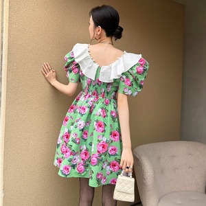 花柄 フリル ラウンドネック 半袖 ワンピース *on542