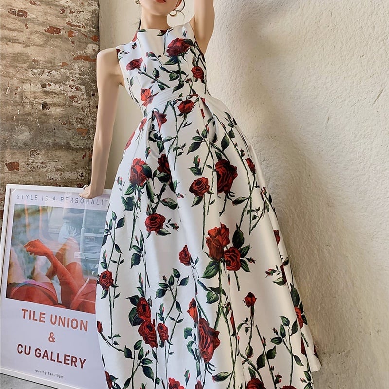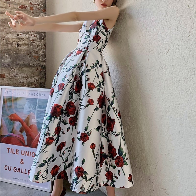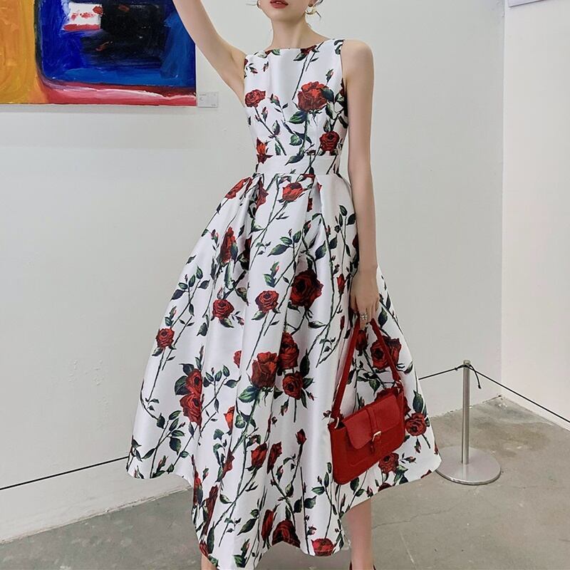 花柄 ハイウエスト ドレス ノースリーブ ワンピース *on543