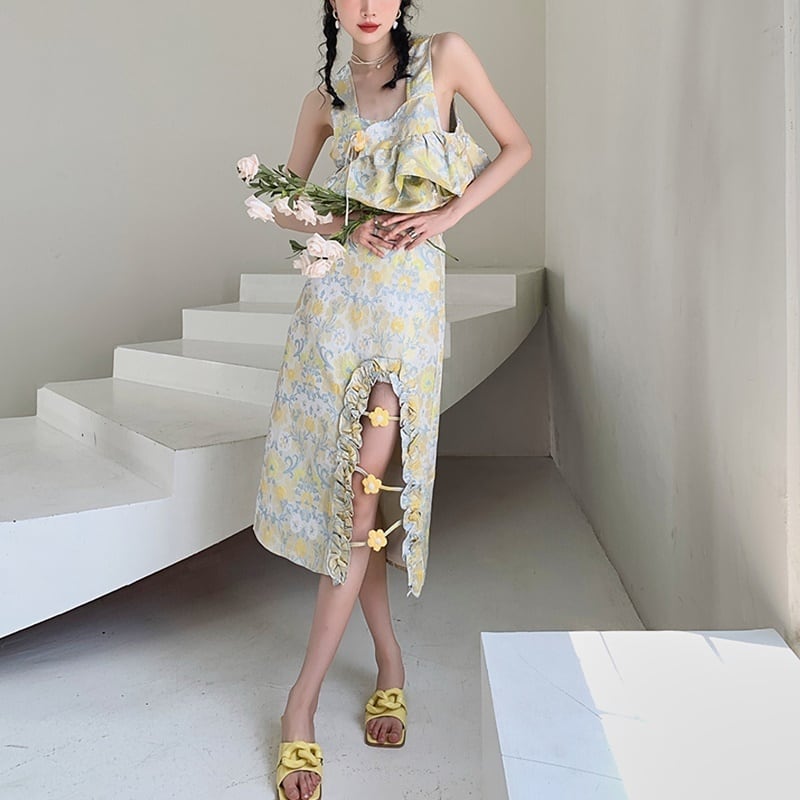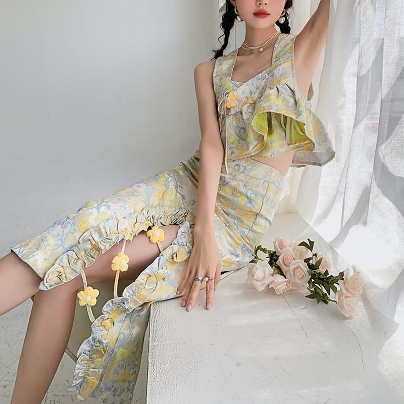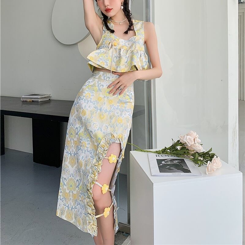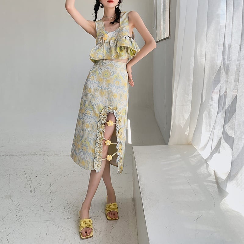 ツーピース ノースリーブ フリル 花柄 スカート セット *set046