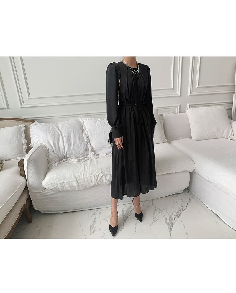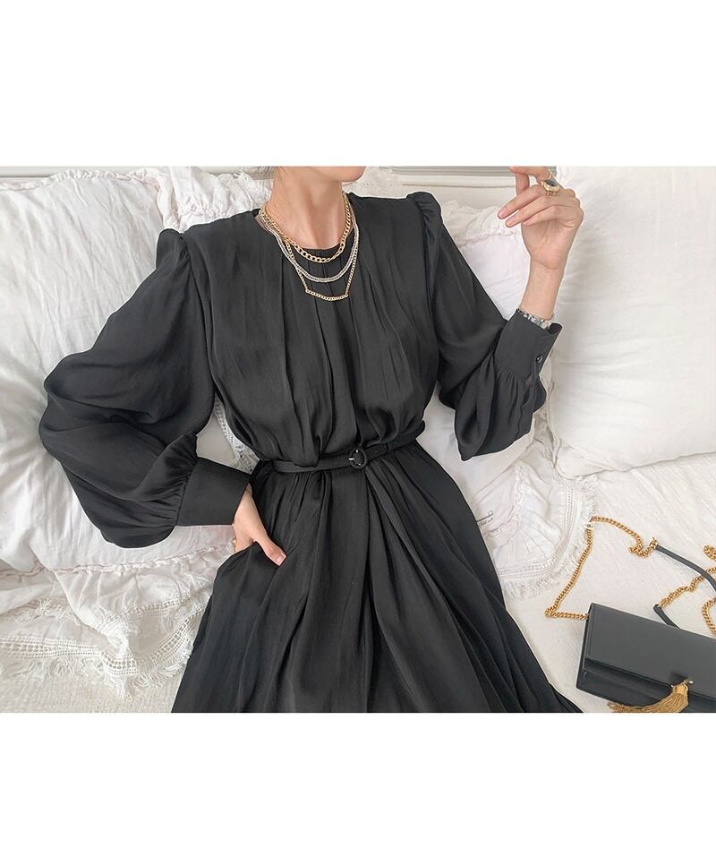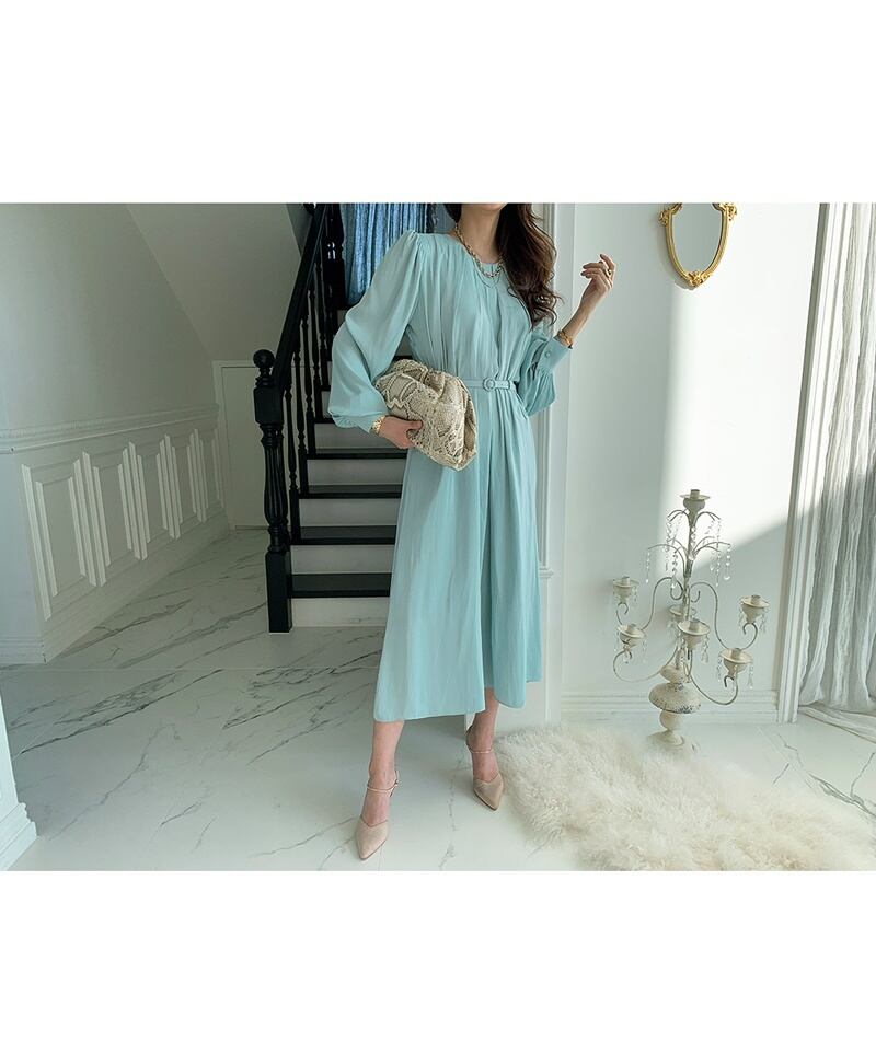 3カラー ベルト ラウンドネック 長袖 ワンピース *on549