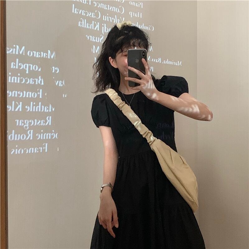6カラー パフスリーブ ラウンドネック 半袖 ワンピース *on557