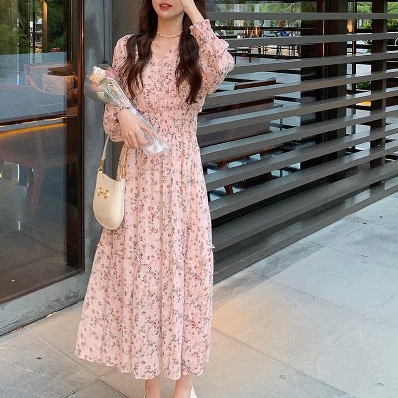 花柄 シフォン Vネック 長袖 ワンピース *on561