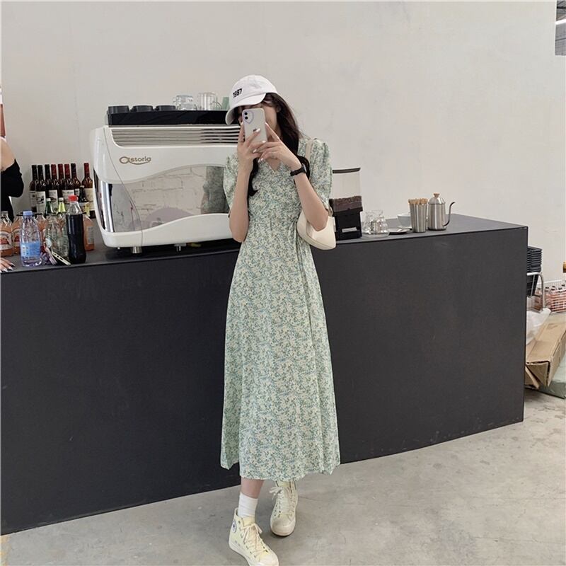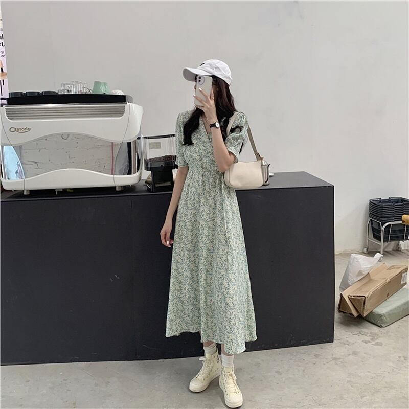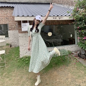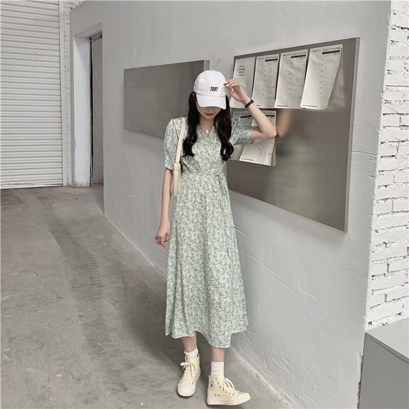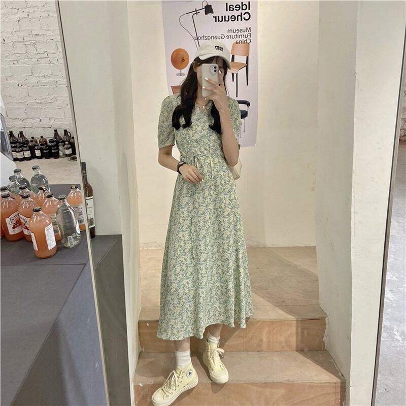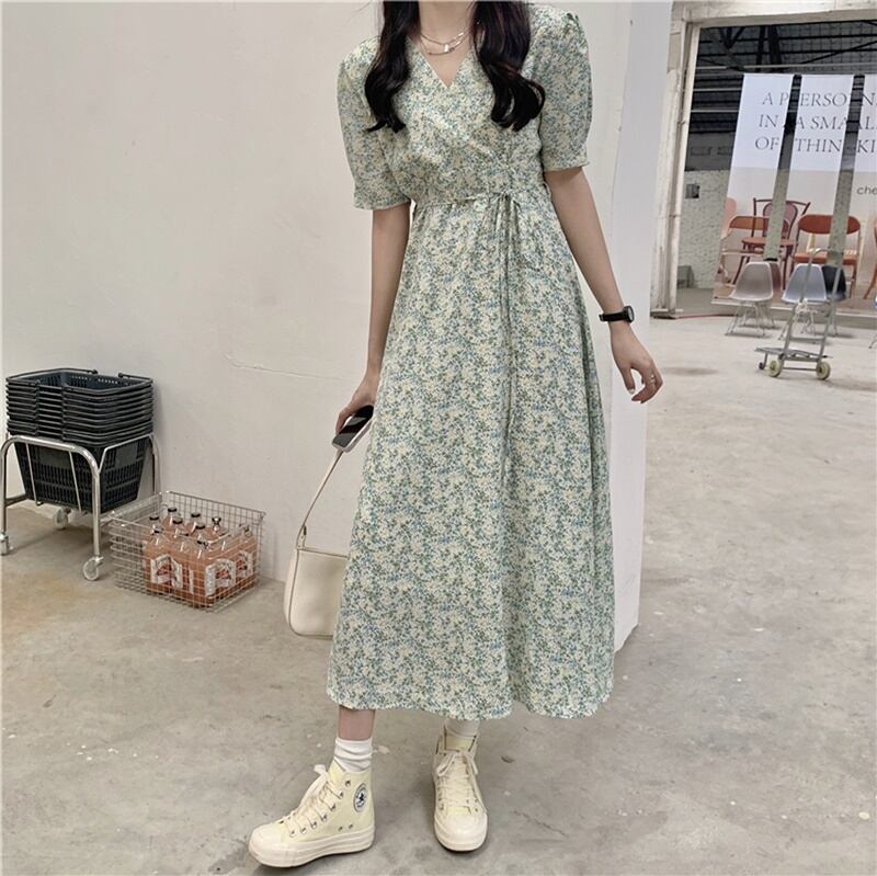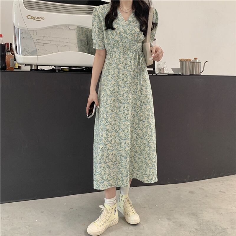 花柄 ウエストリボン Vネック 半袖 ワンピース *on564