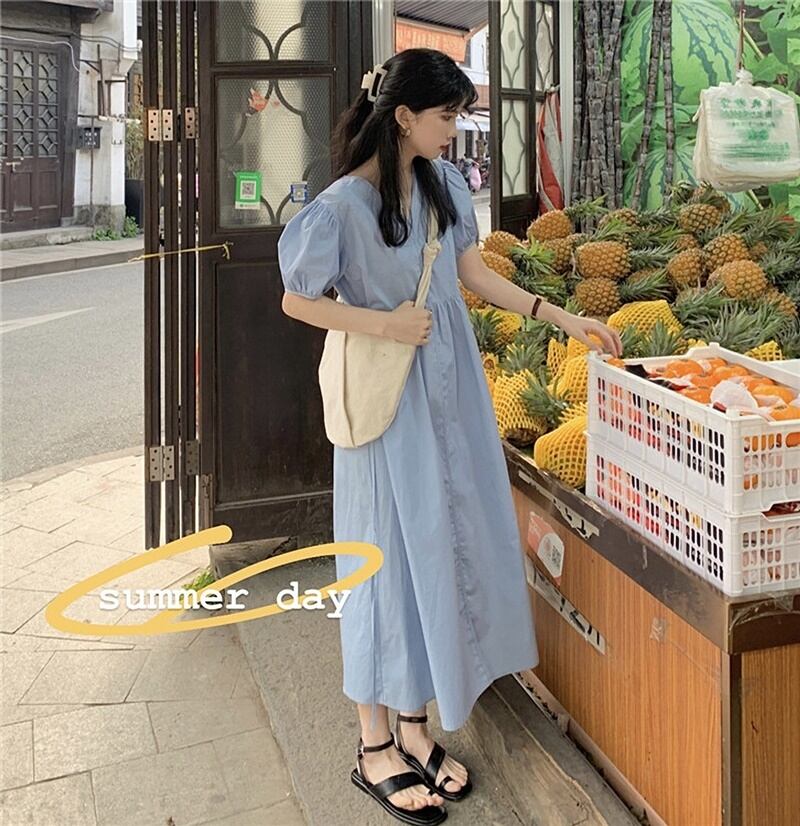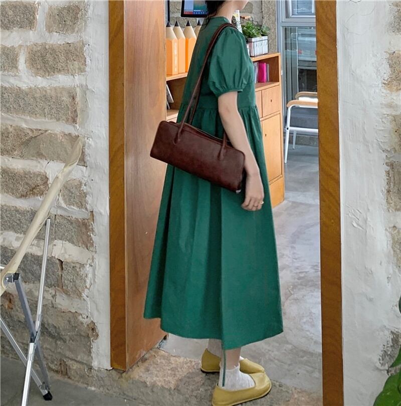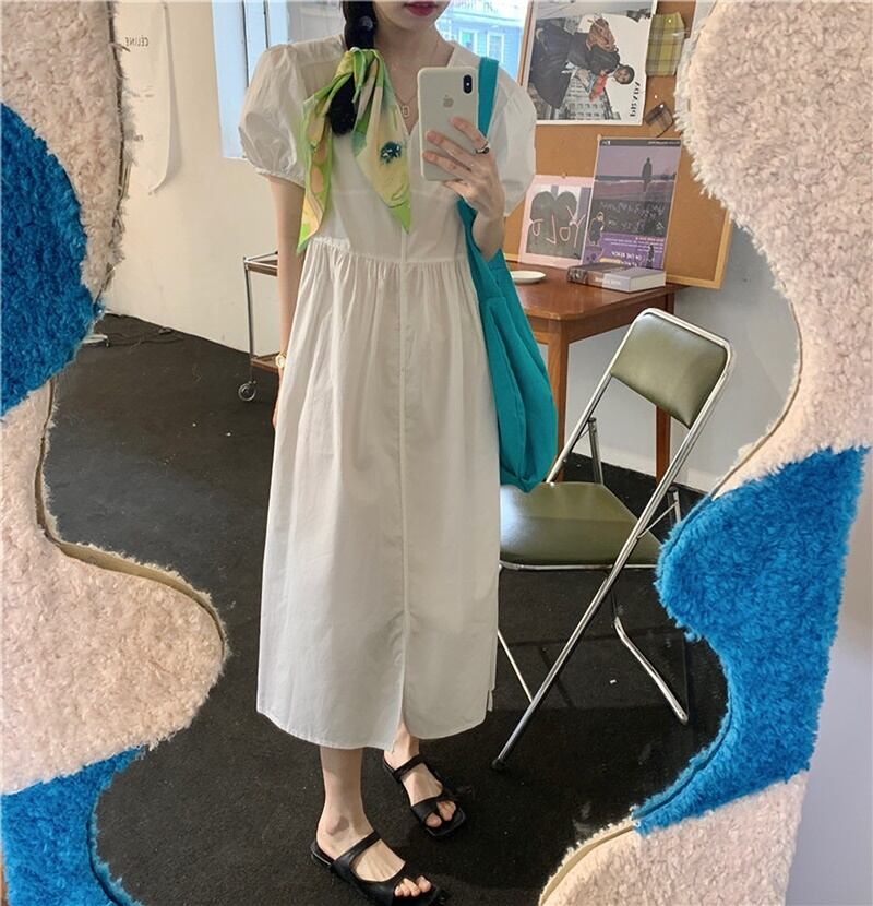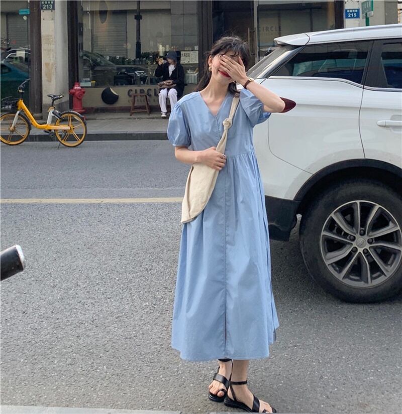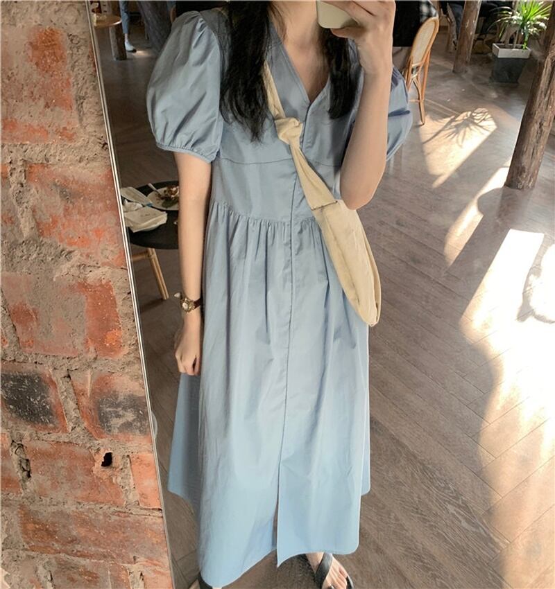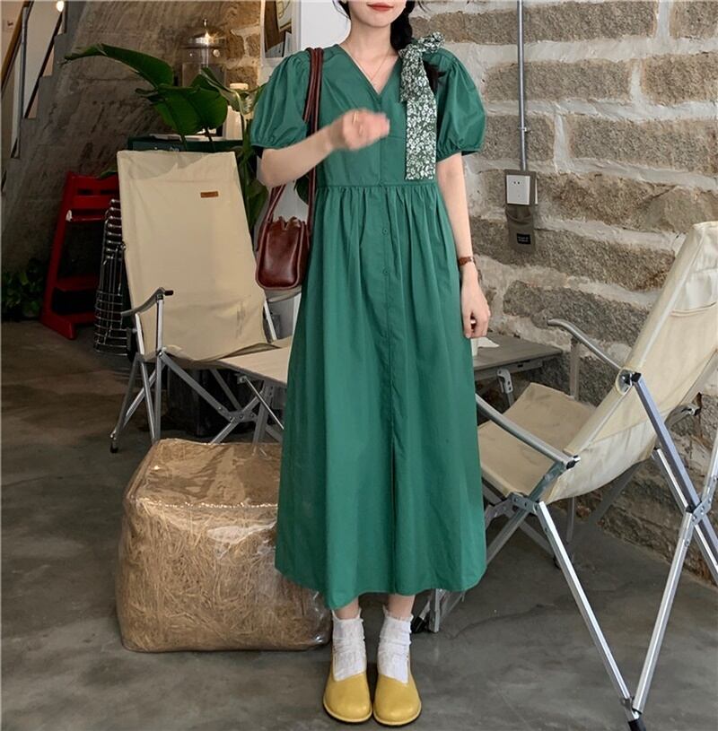 3カラー パフスリーブ Vネック 半袖 ワンピース *on566