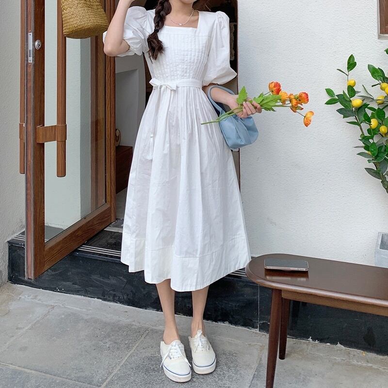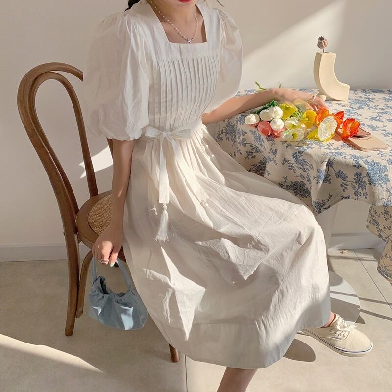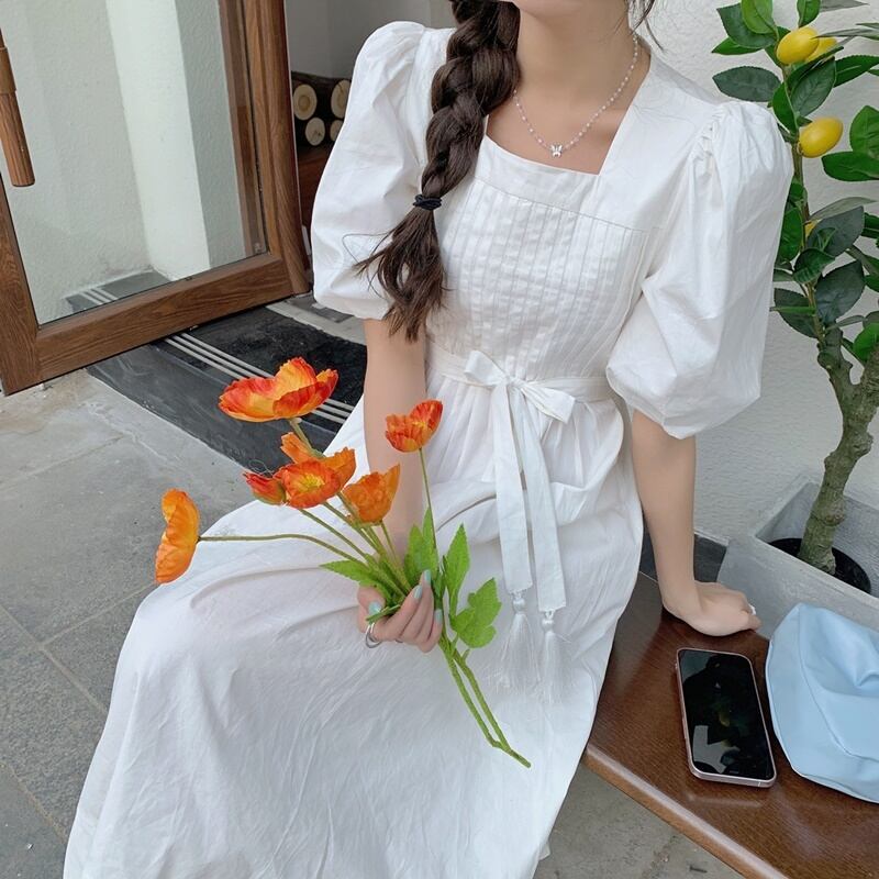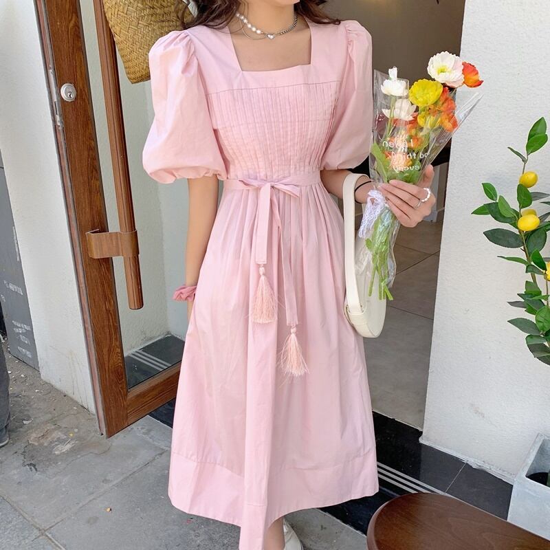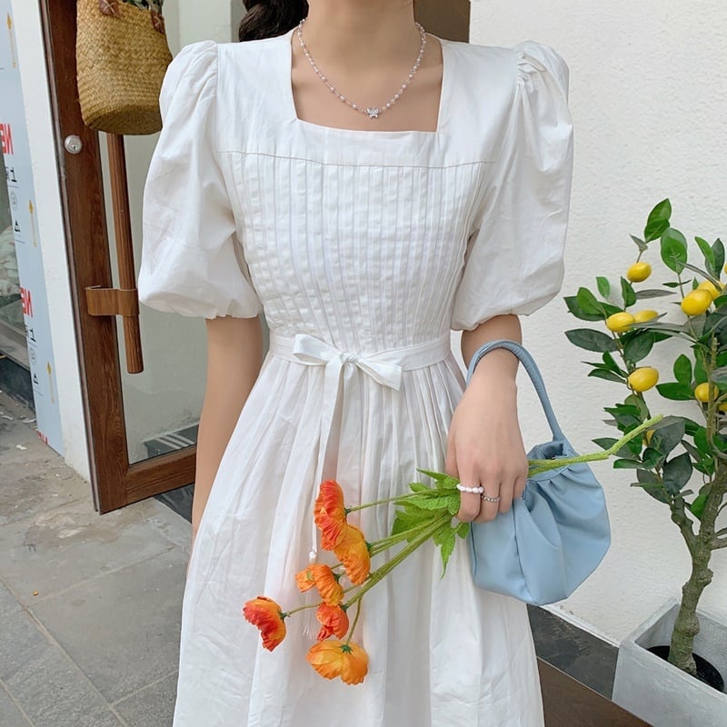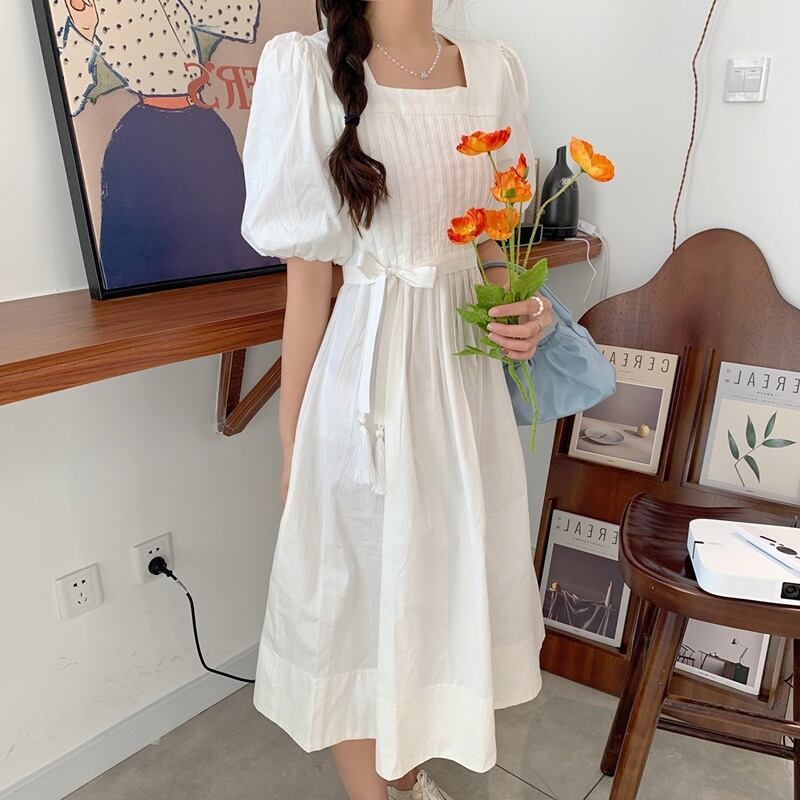 2カラー パフスリーブ リボン スクエアネック 半袖 ワンピース *on568