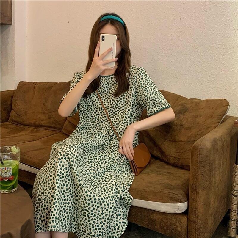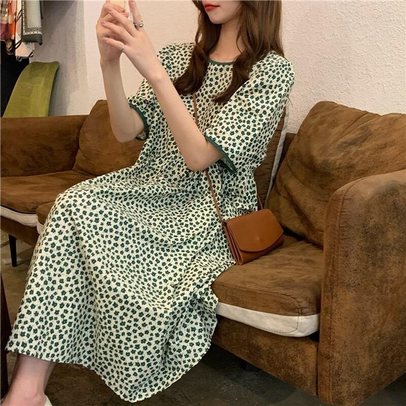 2カラー 花柄 ラウンドネック 半袖 ワンピース *on570