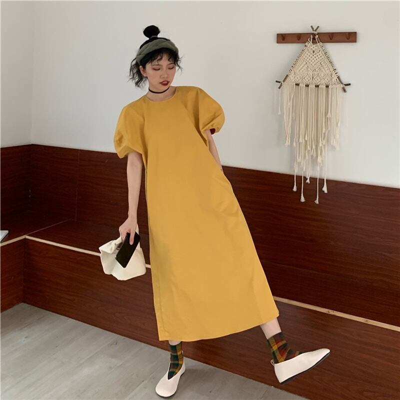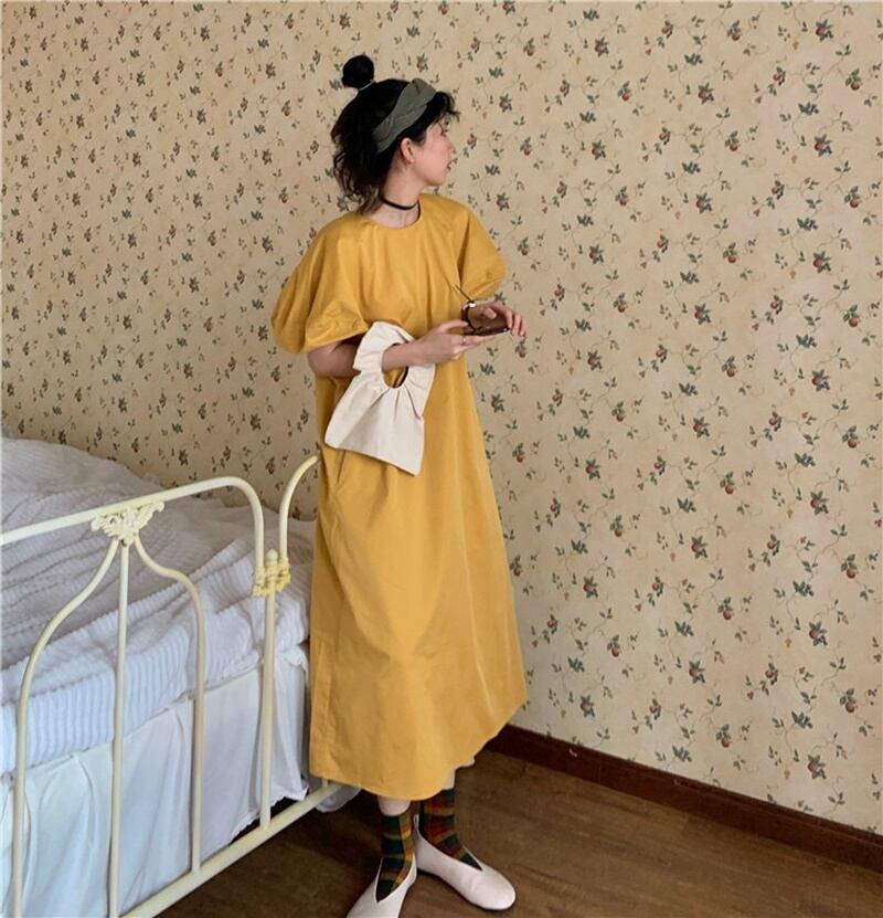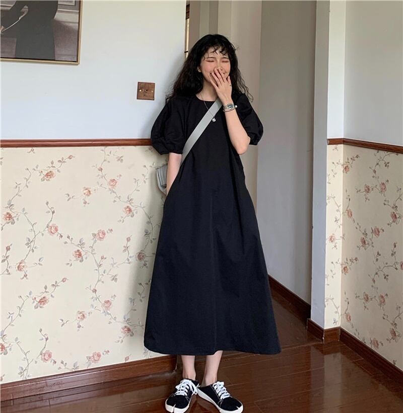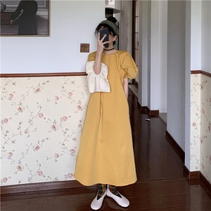 3カラー パフスリーブ ラウンドネック 半袖 ワンピース *on572