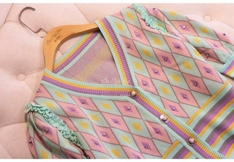 サマーニット ストライプ フリル Vネック 半袖 カーディガン *bl274