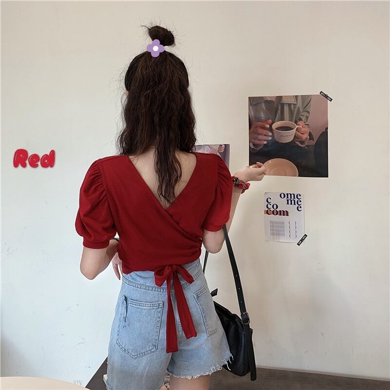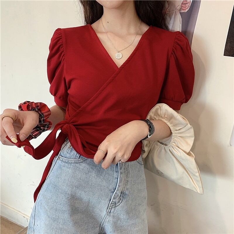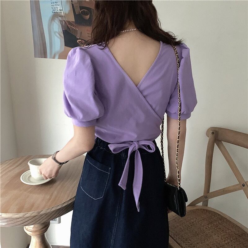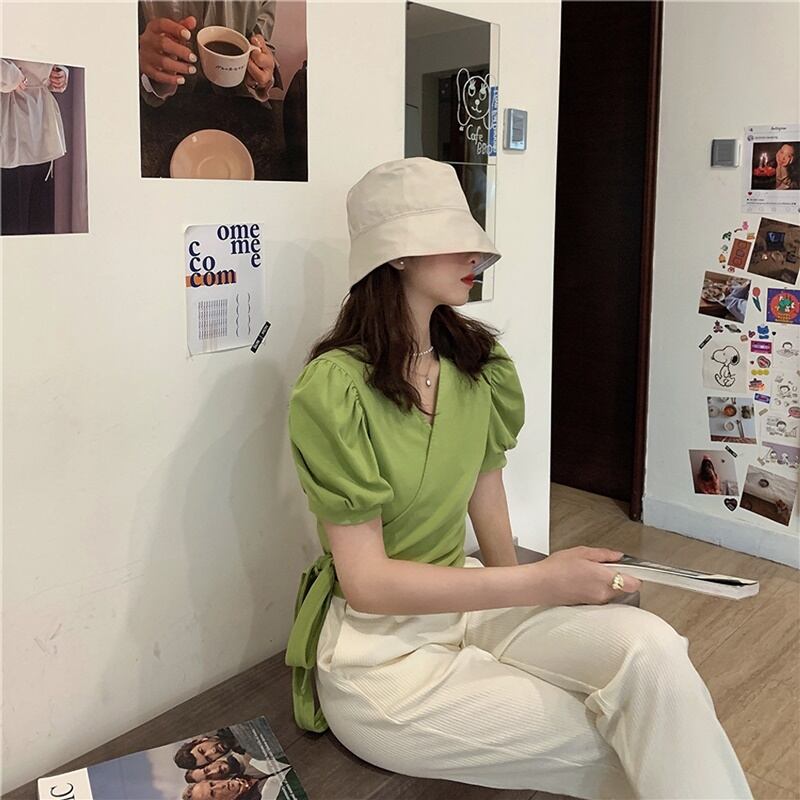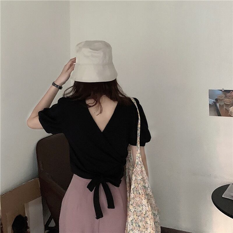 6カラー バックリボン Vネック 半袖 シャツ ブラウス *bl283