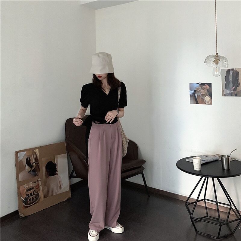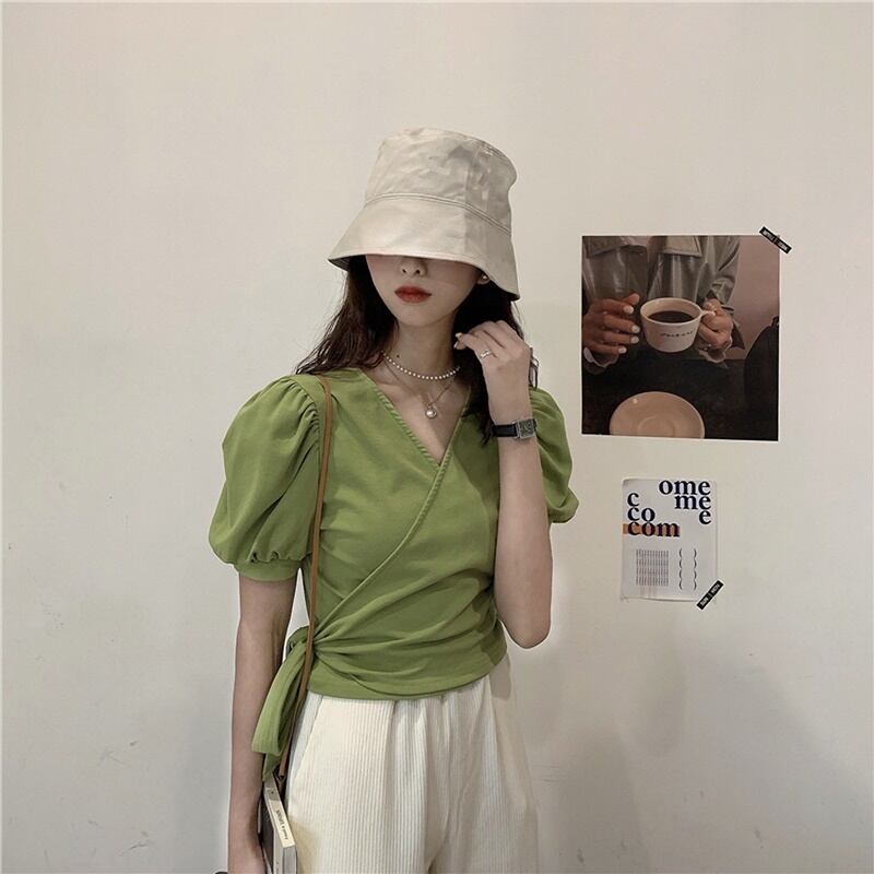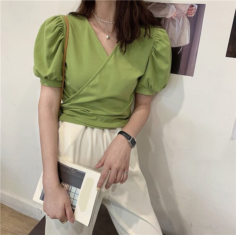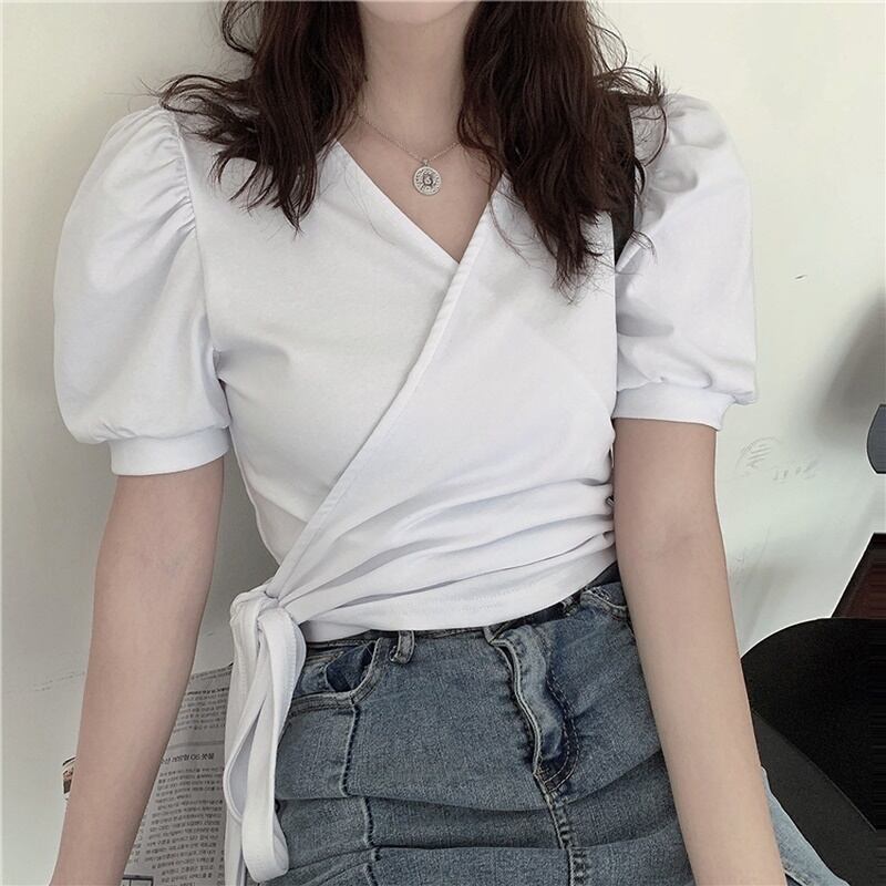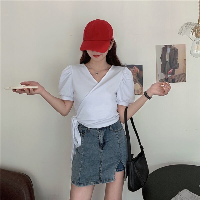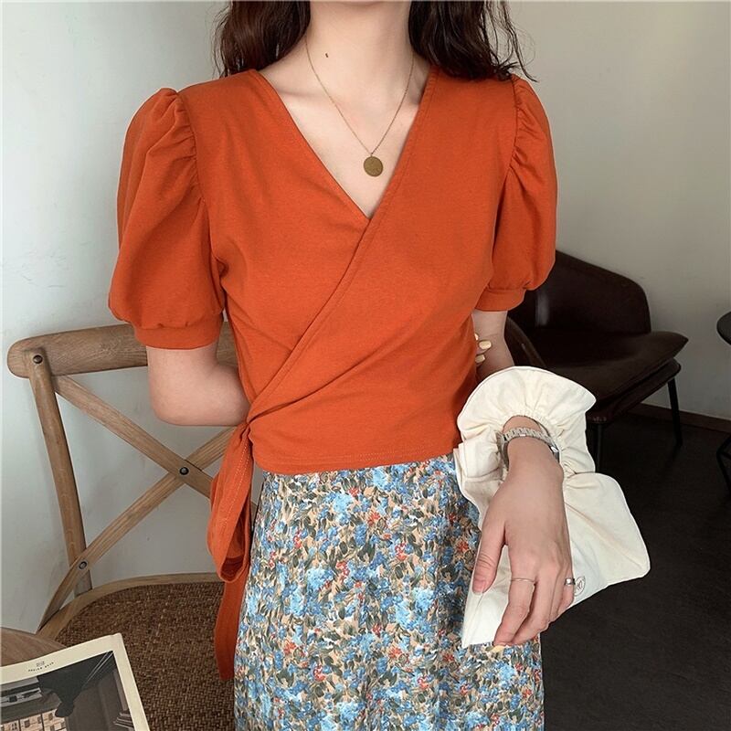 6カラー バックリボン Vネック 半袖 シャツ ブラウス *bl283