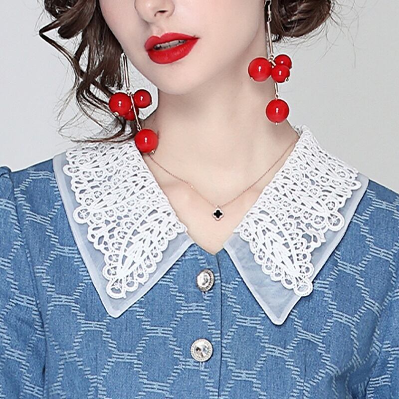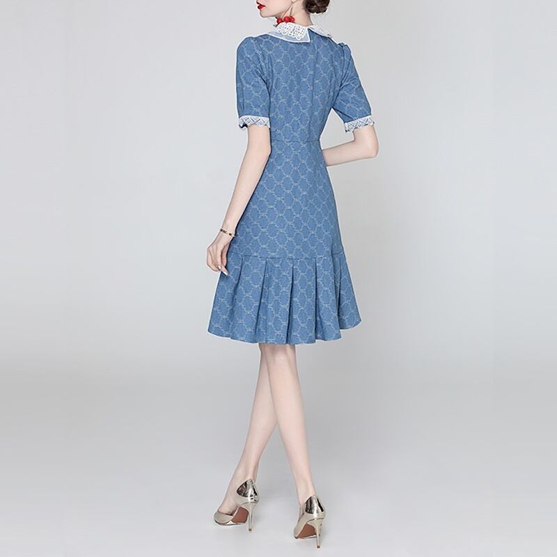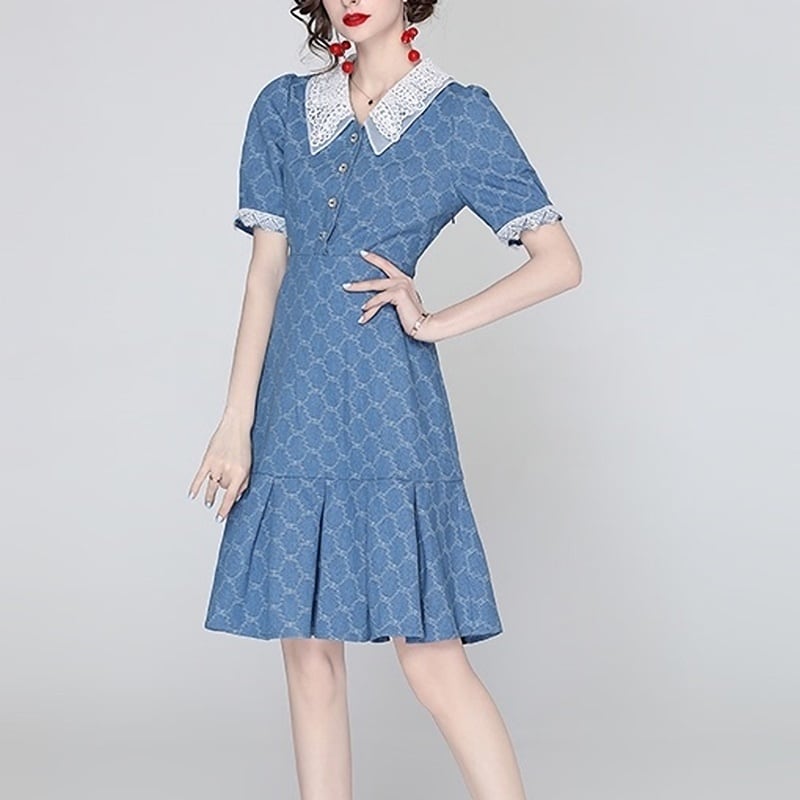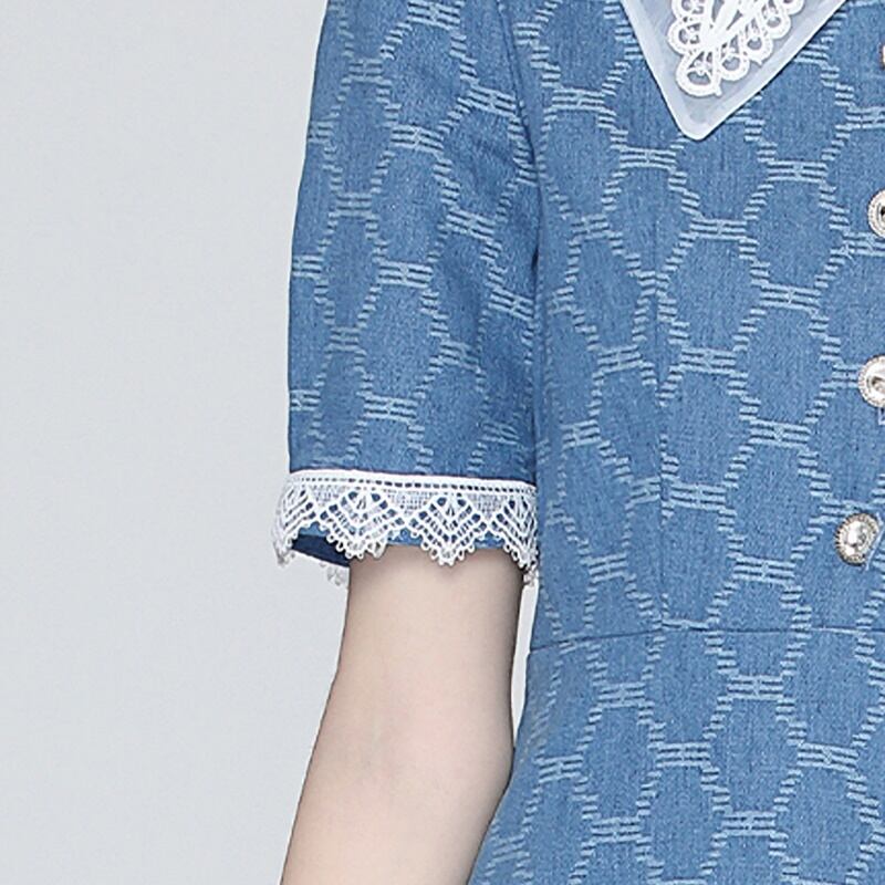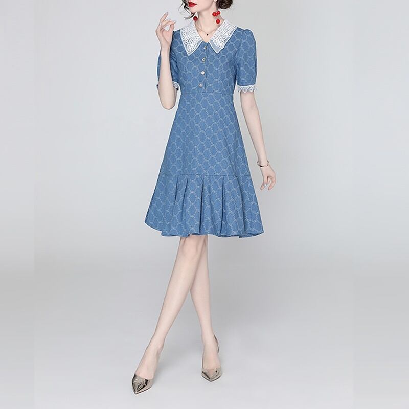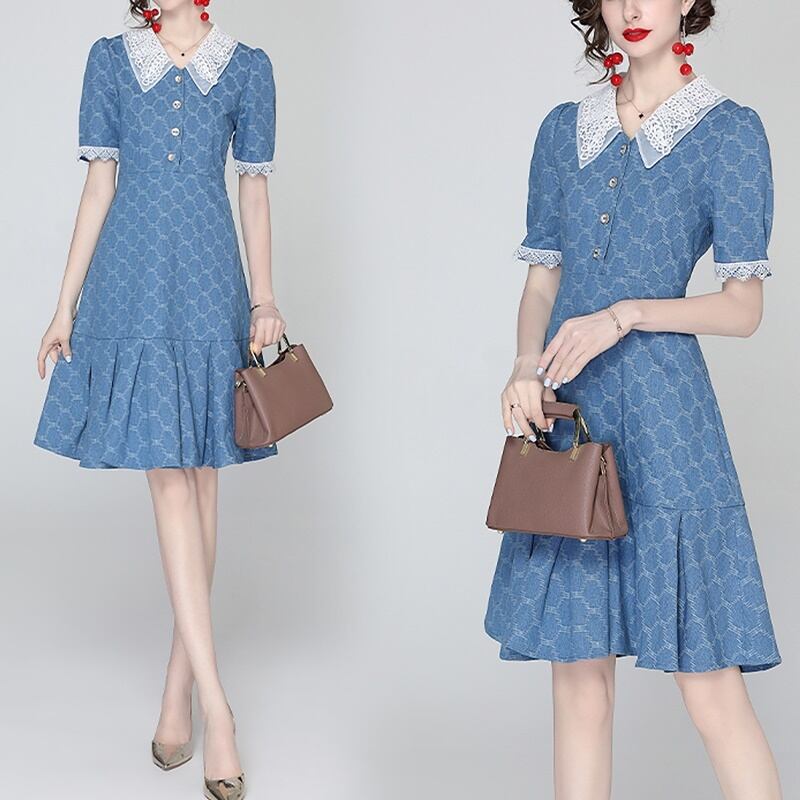 デニム レース Vネック 半袖 ワンピース ドレス *on590